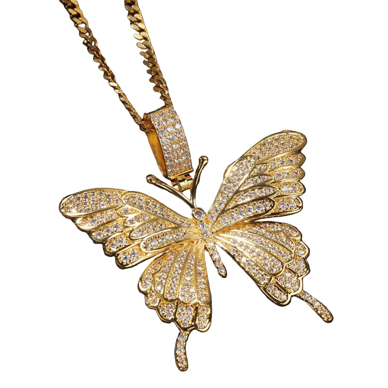 This unisex pendant necklace features a butterfly design set with sparkling cubic zirconia. Made from brass and copper with high-quality gold and silver plating, it is handcrafted with precision for a refined finish. The necklace measures 60 cm in length and is suitable for parties or everyday wear.