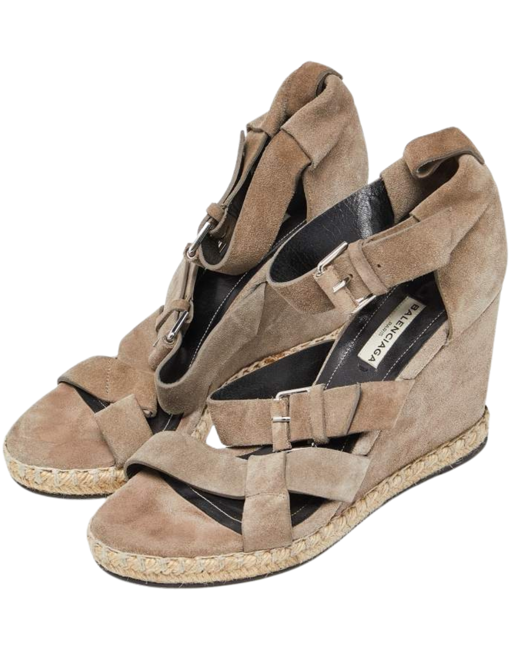 Description: Balenciaga Suede Sandals in light brown showcase a timeless, elegant design crafted from supple suede. Featuring slender cross-foot straps, an adjustable ankle buckle, and a smooth leather insole, these sandals combine comfort and sophistication. The neutral hue makes them versatile for both day and evening wear. Excellent condition with clean soles and minimal signs of use — a refined addition to any designer footwear collection.