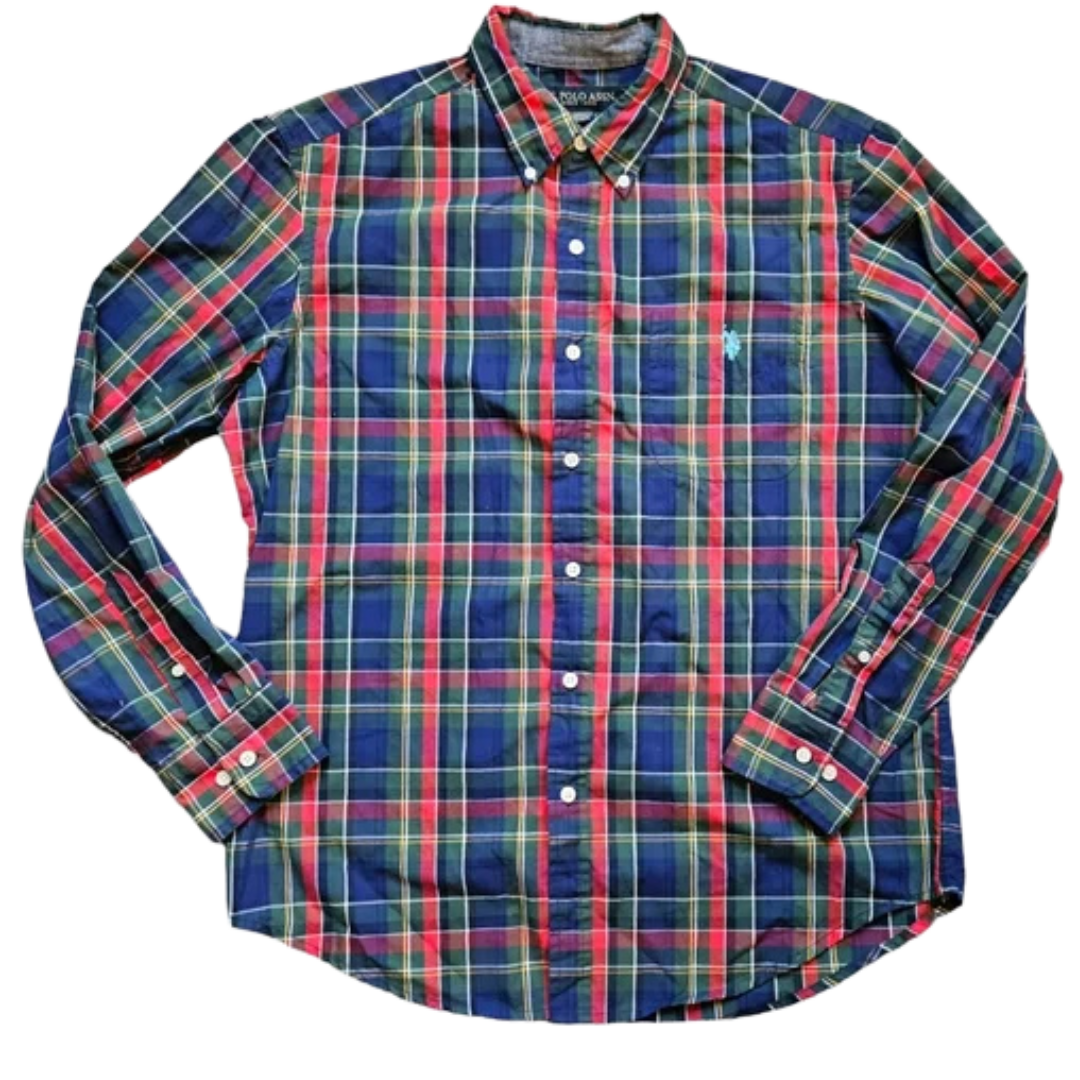 Description: U.S. Polo Assn. Plaid Button-Down Shirt in red, green, and blue combines classic plaid styling with casual versatility. Crafted from soft cotton fabric, this shirt delivers everyday comfort with a polished look that works for casual or semi-casual wear. A timeless U.S. Polo Assn. staple in excellent condition.