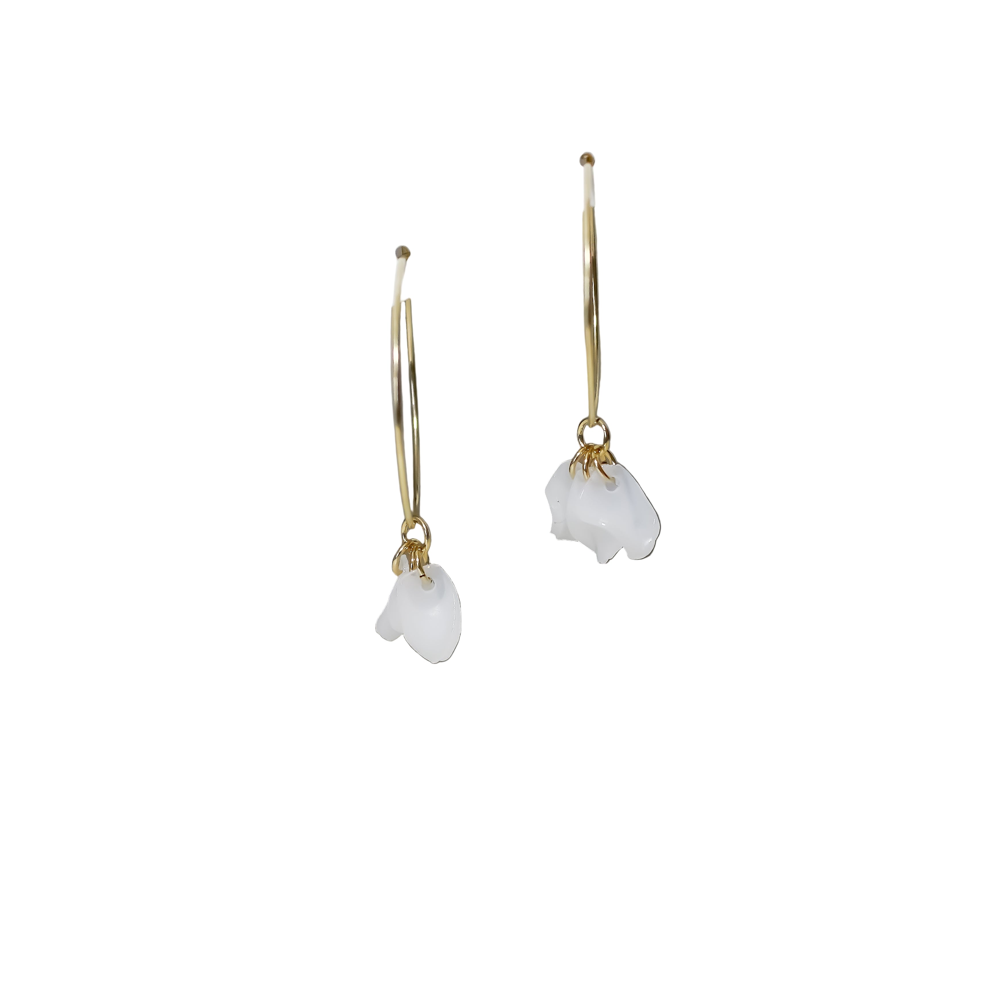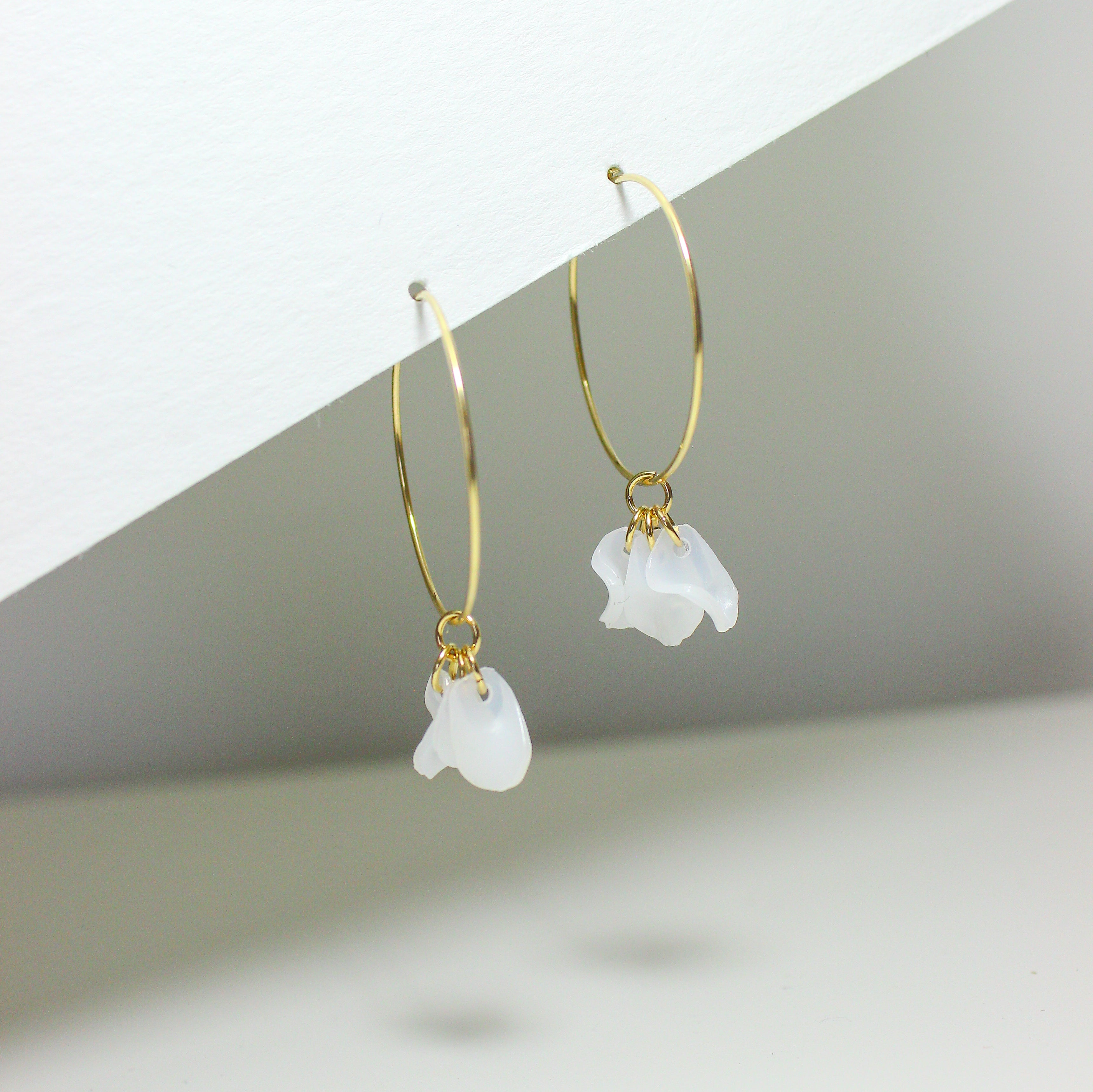 Crafted by hand in Arlington, VA, these delicate hoops bring together thoughtful design and sustainable craftsmanship. Each pair is made with recycled metals and upcycled glass bottles, transformed into soft white petal pendants that catch the light with a subtle, natural glow.