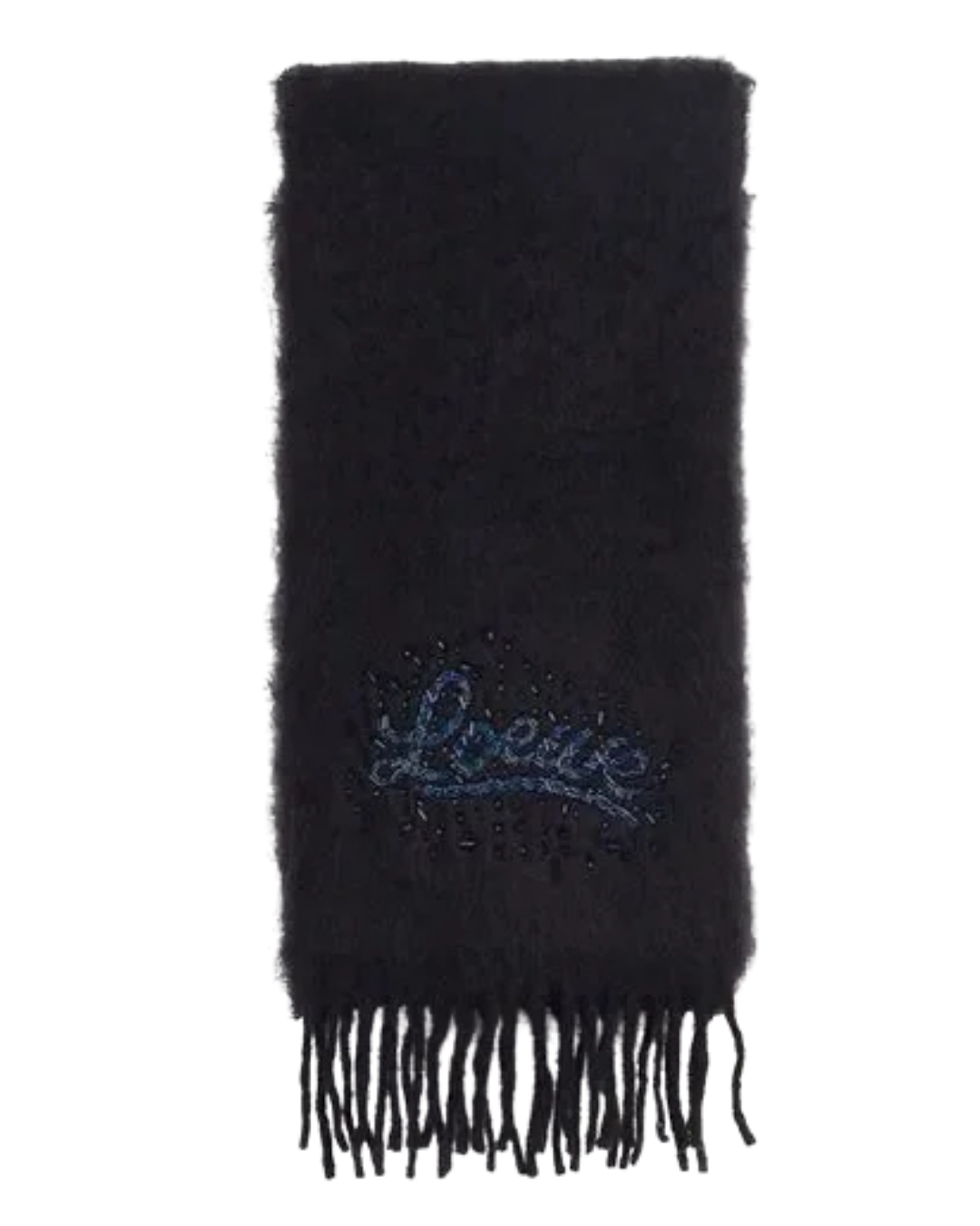 Description: Luxurious and eye-catching, this LOEWE mohair scarf features a subtle sparkle woven through its black and blue colorway. Crafted from a soft mohair blend, it offers warmth with a lightweight, fuzzy texture. Finished with fringed edges and the signature LOEWE logo tab for an elevated winter accessory.