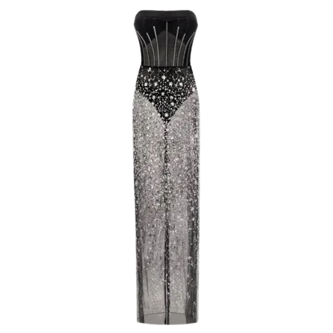 Description: The Milla Crystal-Covered Maxi Dress is a breathtaking statement piece that radiates high-glamour allure. Crafted from sheer black fabric and intricately covered in sparkling crystals, this gown captures light from every angle for a show-stopping finish. The sleek silhouette hugs the body beautifully, balancing its dramatic shimmer with refined elegance. Perfect for galas, red-carpet events, or high-fashion evenings, this gown is new without tags — bold, luminous, and made to turn heads.