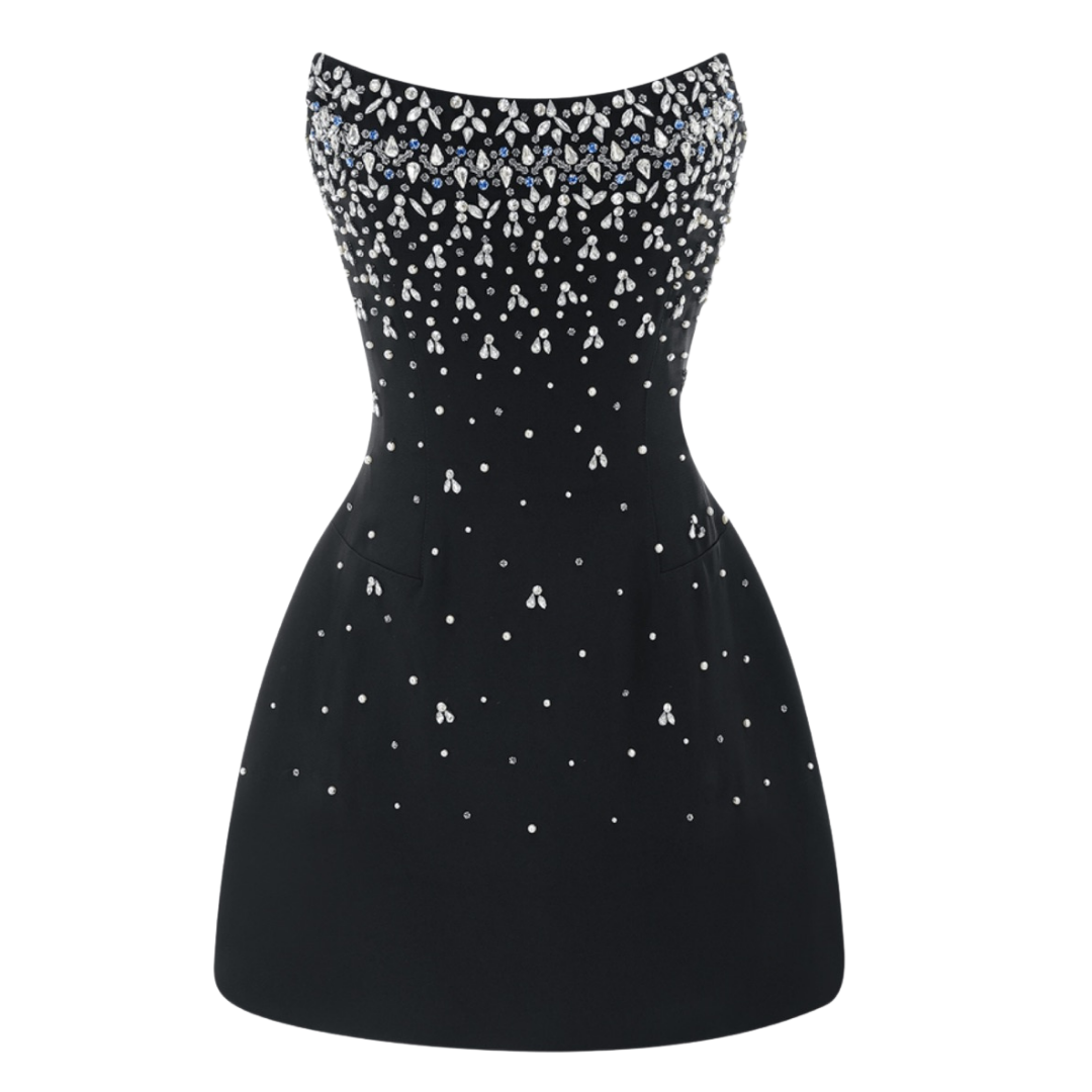 Description: The Miss Rosier Melisande Dress is a captivating statement piece that perfectly balances sophistication and shimmer. Crafted in a sleek black fabric adorned with silver sparkle detailing, this dress catches the light with every movement. Its flattering silhouette accentuates the figure while maintaining an elegant flow, ideal for evening events, cocktail parties, or special celebrations. Fully lined for comfort, it embodies the brand’s signature glamour — bold, timeless, and effortlessly chic.