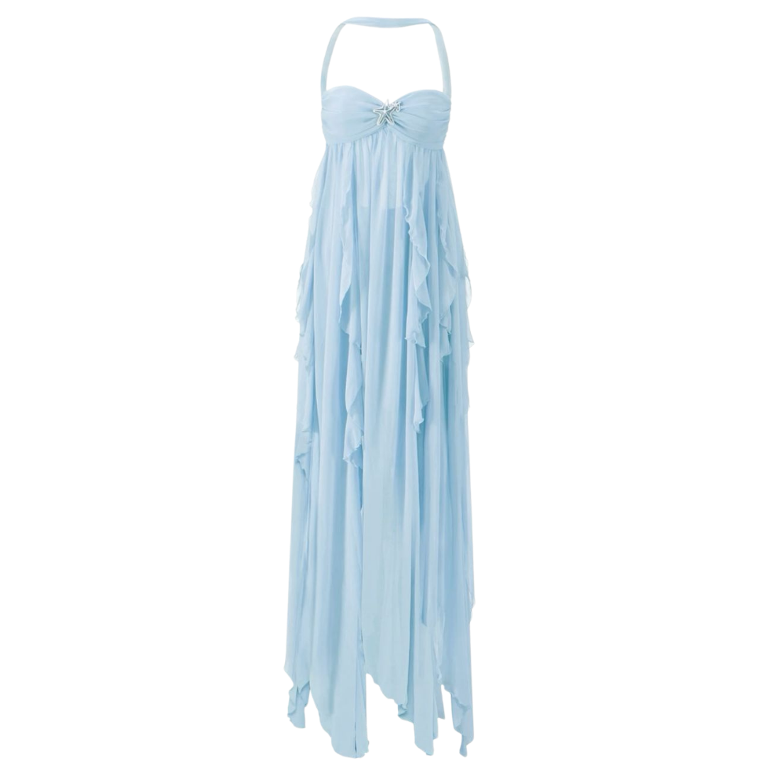 Description: The Nana Jacqueline Mariah Ruffle Drape Dress embodies effortless romance and feminine sophistication. Crafted in a soft light blue hue, this dress features delicate ruffle accents, a flattering draped silhouette, and a fitted waist that enhances the figure. The lightweight fabric moves gracefully, making it perfect for spring events, date nights, or special occasions. In great condition with minimal signs of wear — elegant, playful, and distinctly chic.