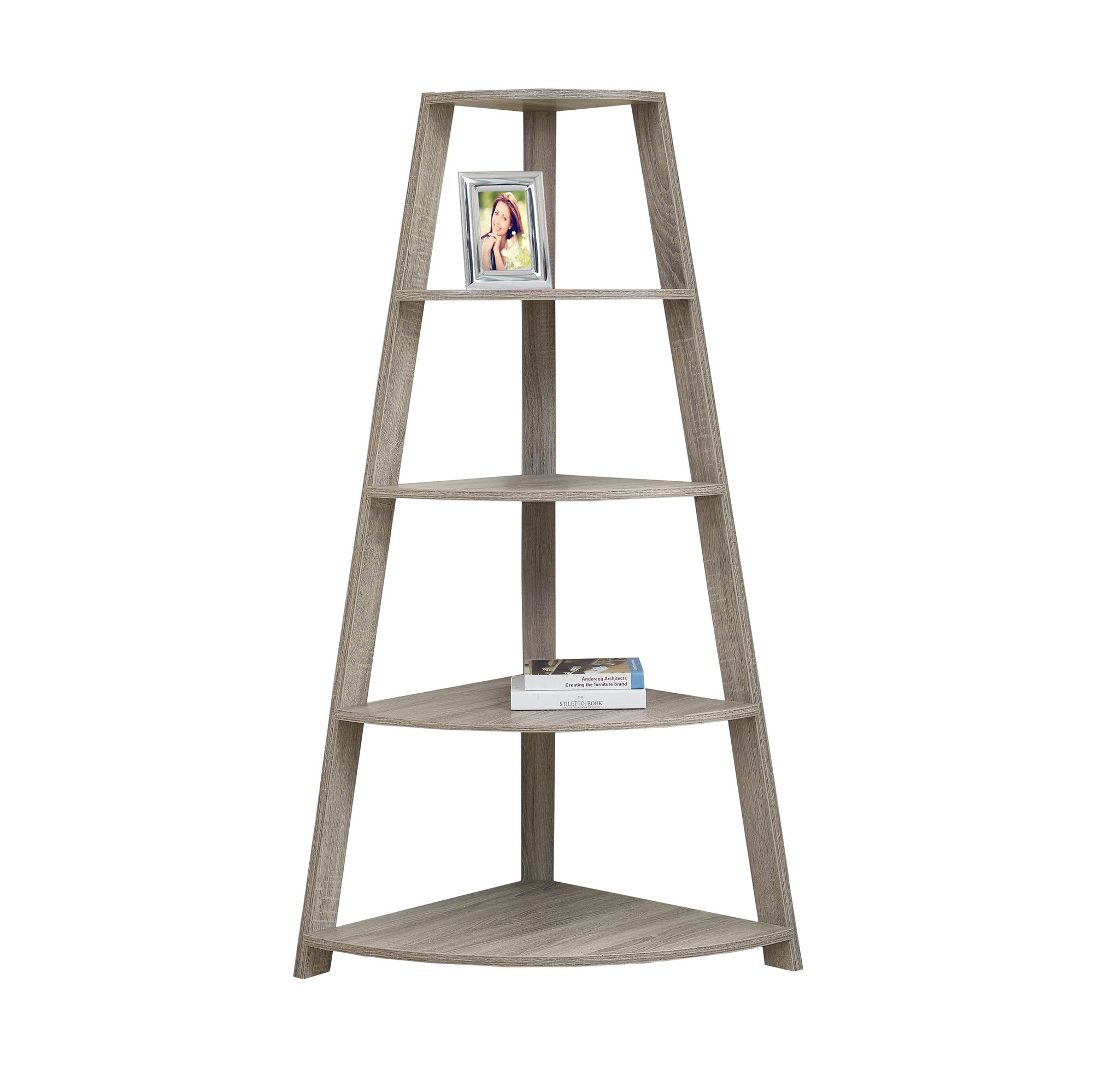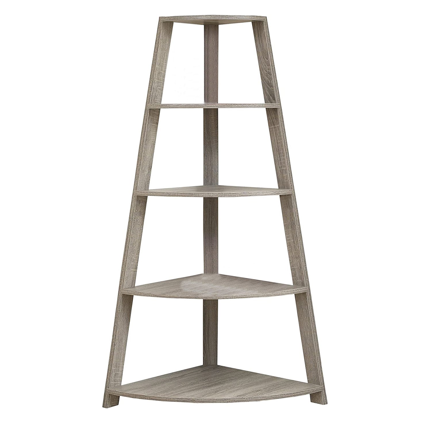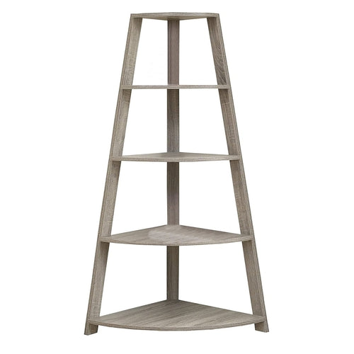 Add the perfect corner piece to your living room, hallway, home office, or den with this dark taupe accent bookcase complete with four tray 1inches thick style shelves. This contemporary/transitional shelving unit blends well with any decor providing additional display space without sacrificing style. tipping pervention hardware included.