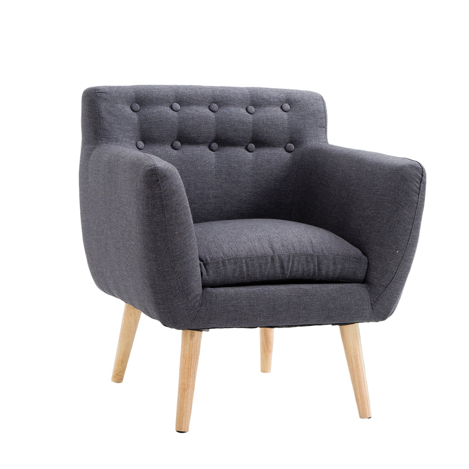 Introduce timeless design to your space with this mid-century inspired accent chair. Crafted with a solid wood frame and upholstered in a textured linen fabric, it offers both comfort and style. The tufted seat, gently curved armrests, and thick padded cushions create an inviting place to unwind, while the dark grey finish blends seamlessly with modern, minimalist, or Scandinavian interiors.