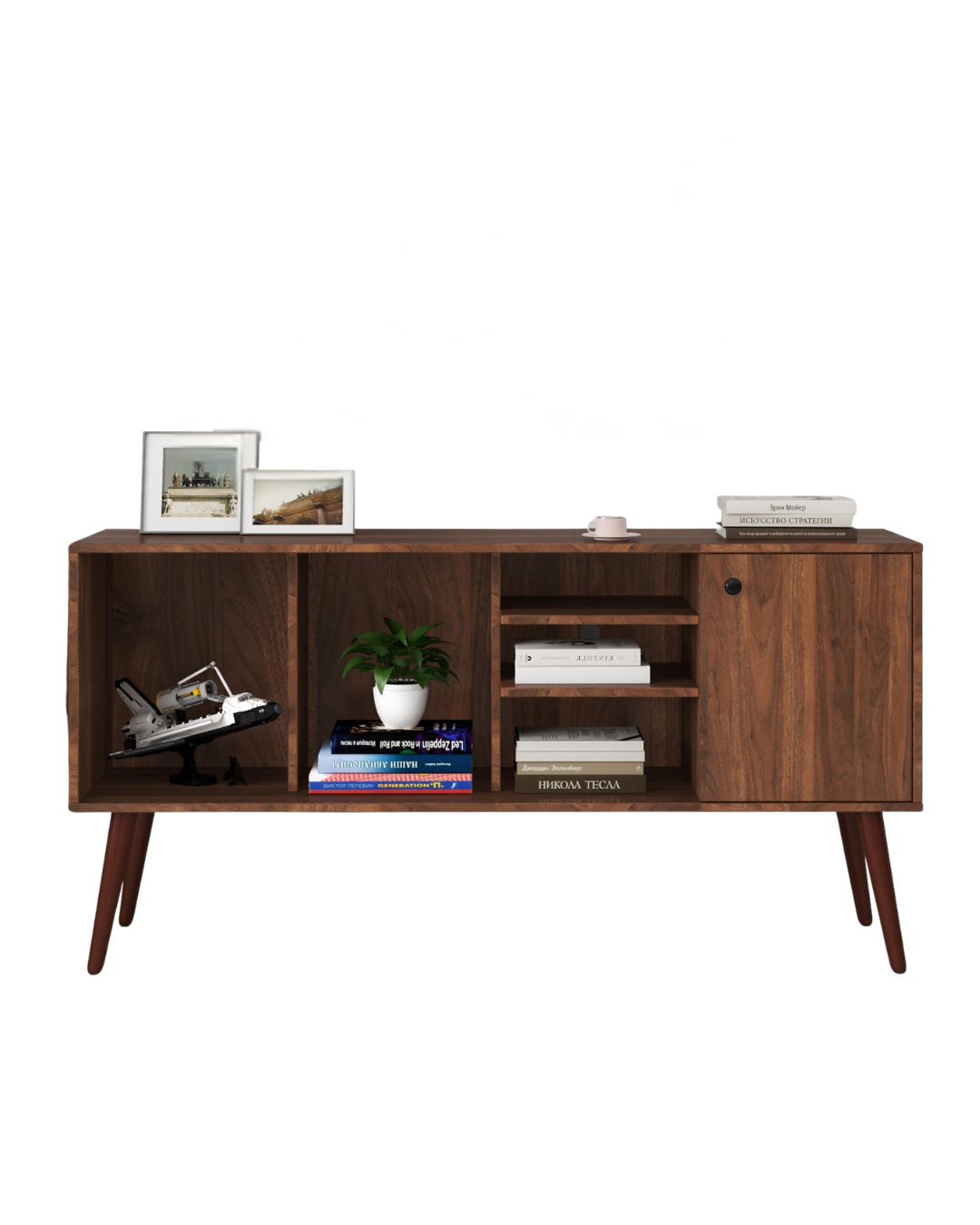 This stylish walnut TV stand features one enclosed storage compartment and three open shelves, perfect for organizing media devices and displaying decor. Its durable wooden frame with rich textured veneer and four solid wood legs ensures stability and longevity.