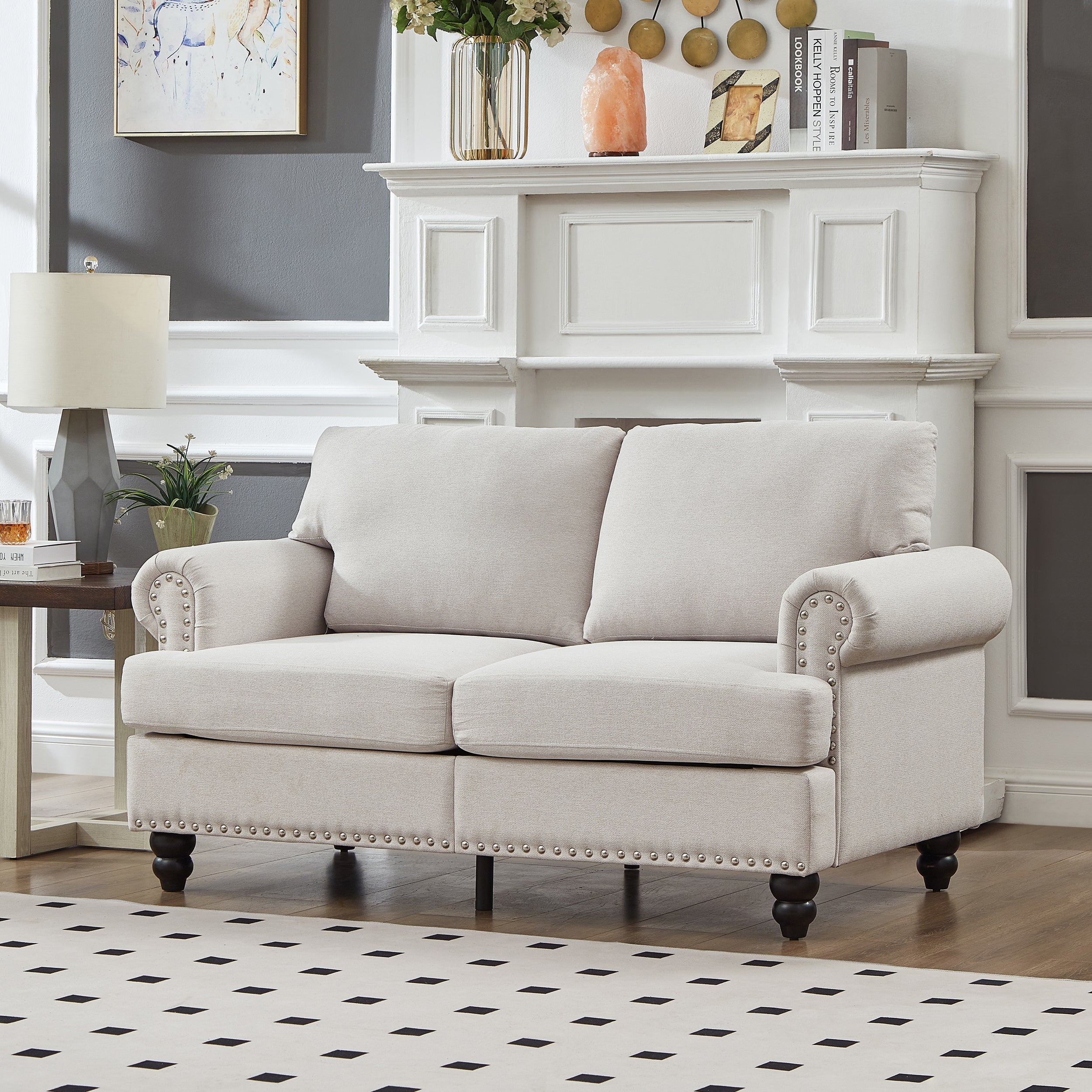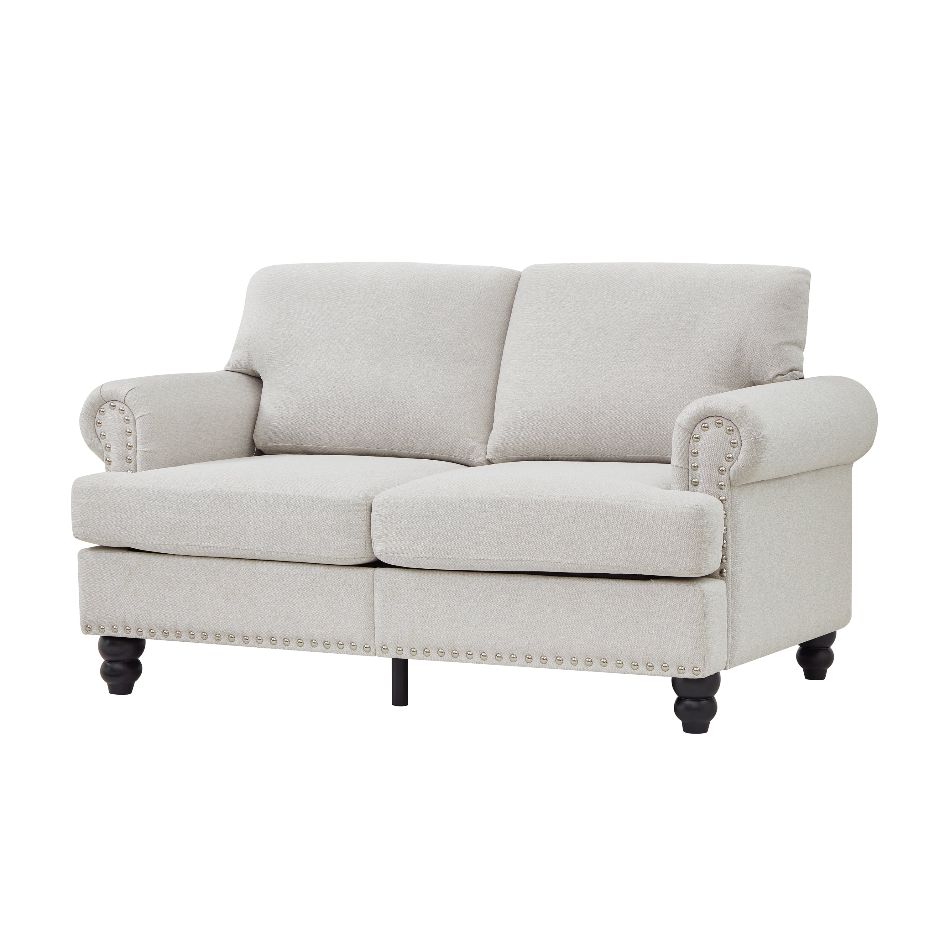 The 59.5" Modern Classic Design Loveseat combines timeless elegance with modern functionality. Featuring a classic American design, round armrests adorned with silver nailhead accents, and soft fabric upholstery, this loveseat brings both style and comfort to any living space. Perfect for cozy living rooms, apartments, or family rooms, it offers durable construction and thoughtful details for everyday use.