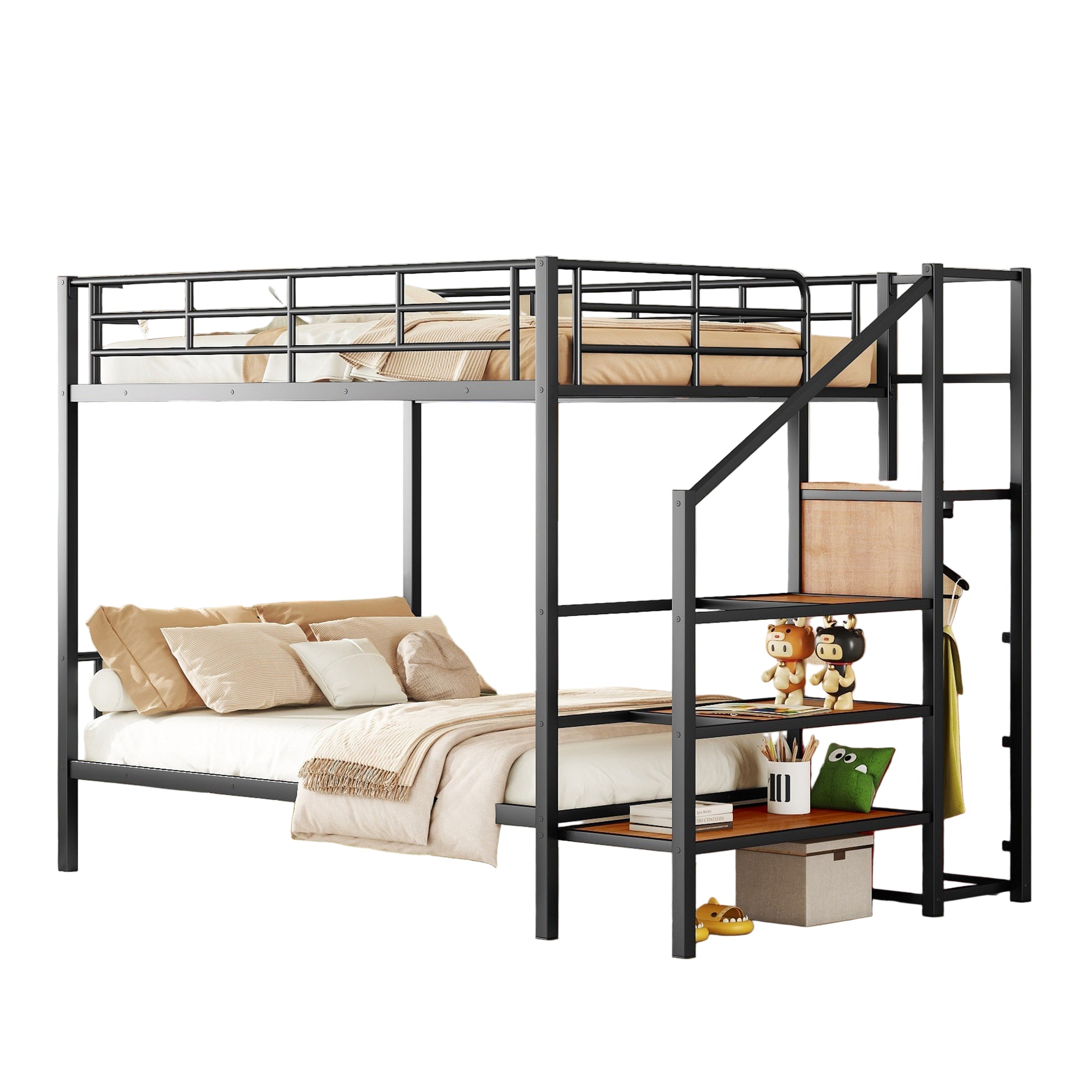 This full-over-full metal bunk bed is designed to save space while providing sturdy and safe sleeping arrangements. The iron frame features a clean-cut, contemporary design with a chrome finish. The lateral three-layer ladder doubles as shelves, and a built-in wardrobe beneath the ladder offers additional storage. Full-length gridded guardrails enhance safety on the top bunk. This bunk bed is ideal for growing families, accommodating children and teens comfortably. Mattress not included.