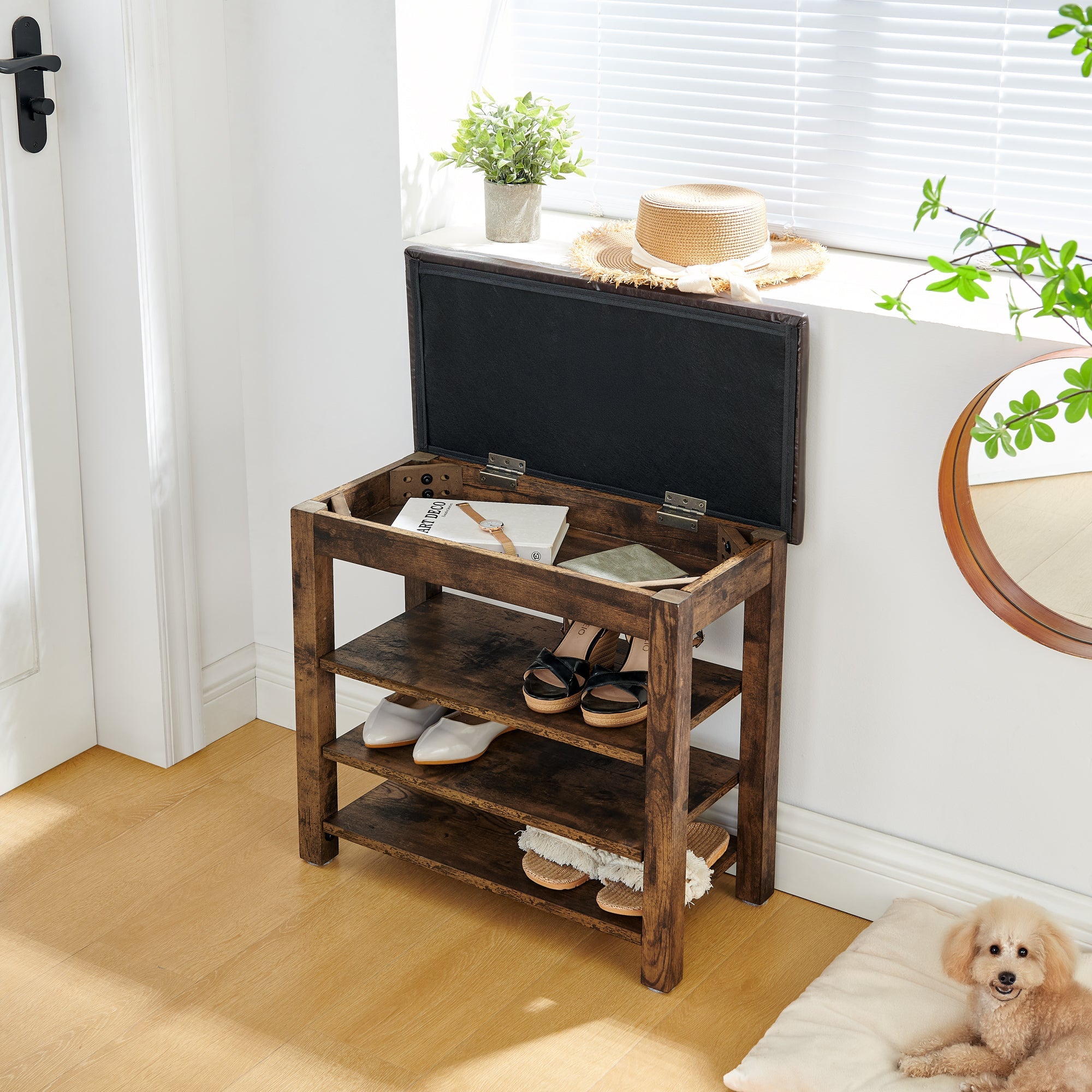 - This rubberwood frame is paired with a polyurethane leather seat cushion, which is both textured and very comfortable. Its adjustable height design, combined with three layers of ventilation and moisture-proof storage space as well as the storage space beneath the seat, effectively solves the clutter problem at the entrance and enhances the overall home style.