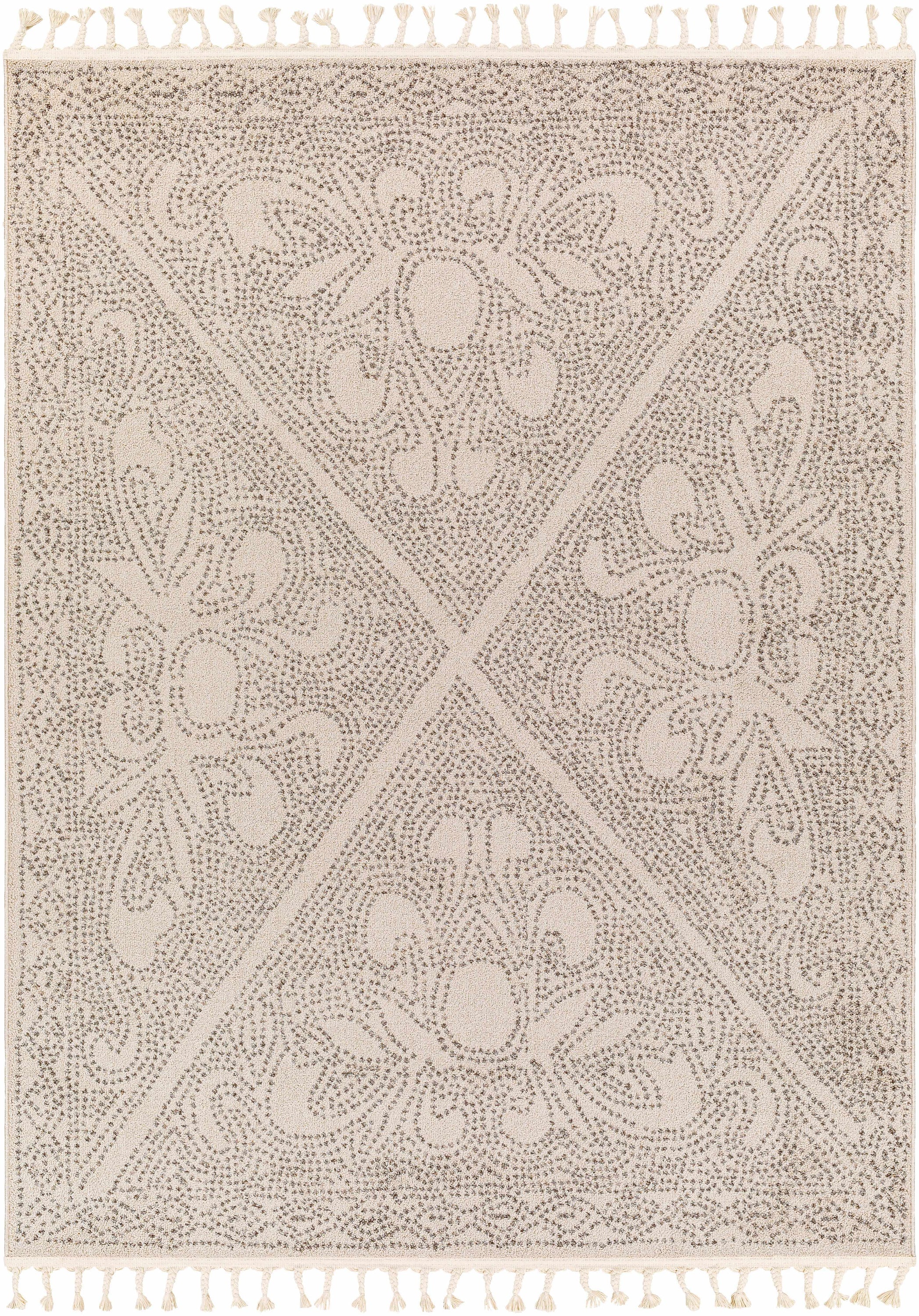 The Birdwood Cream & Brown Area Rug blends intricate dot-formed patterns, large cross designs, and subtle floral elements for a sophisticated and versatile look. Crafted from 100% polypropylene and machine-woven for durability, this medium-pile rug offers comfort underfoot while enhancing your décor with neutral cream and brown tones. Fringed edges add a stylish finishing touch, making it perfect for living rooms, bedrooms, or any space needing warmth and texture.