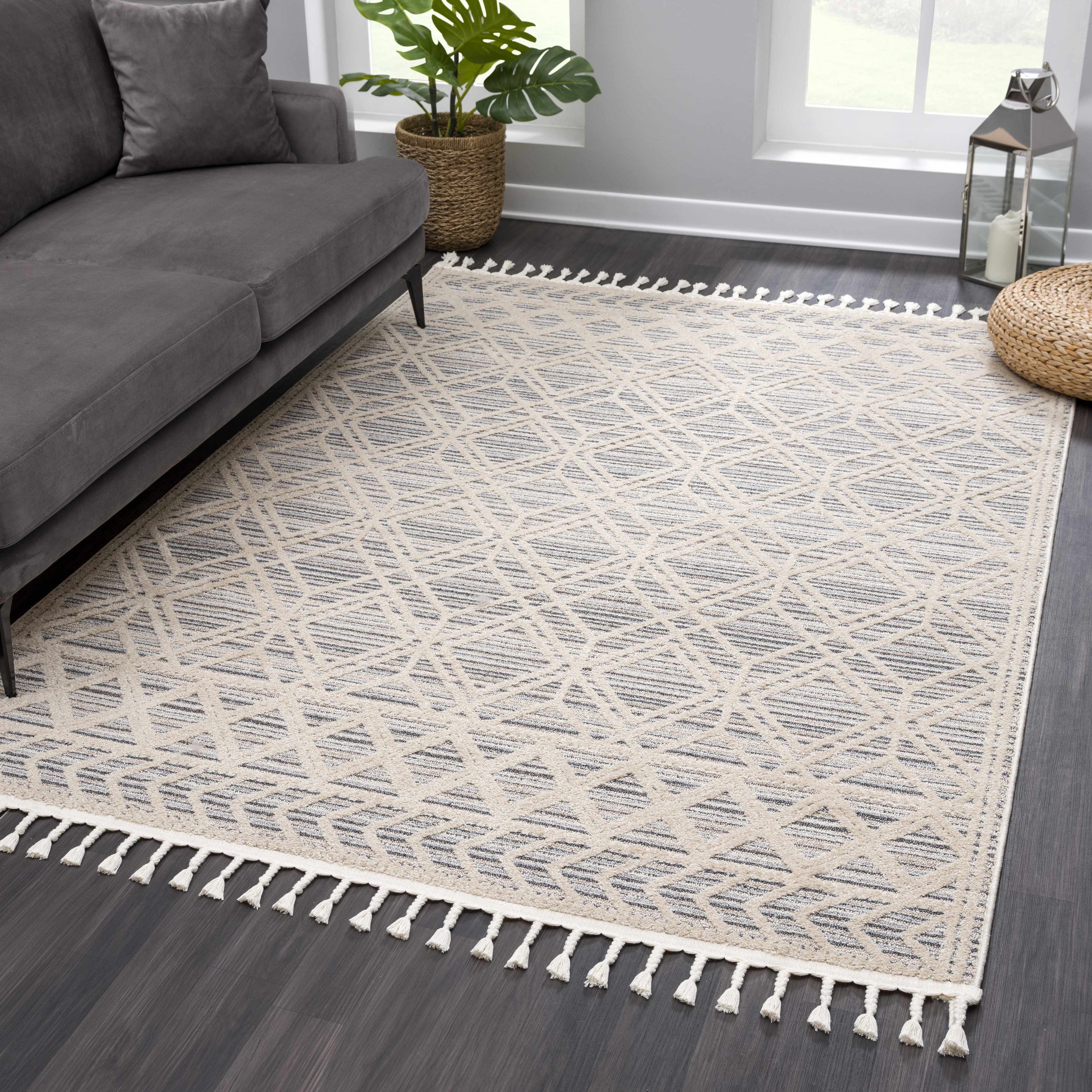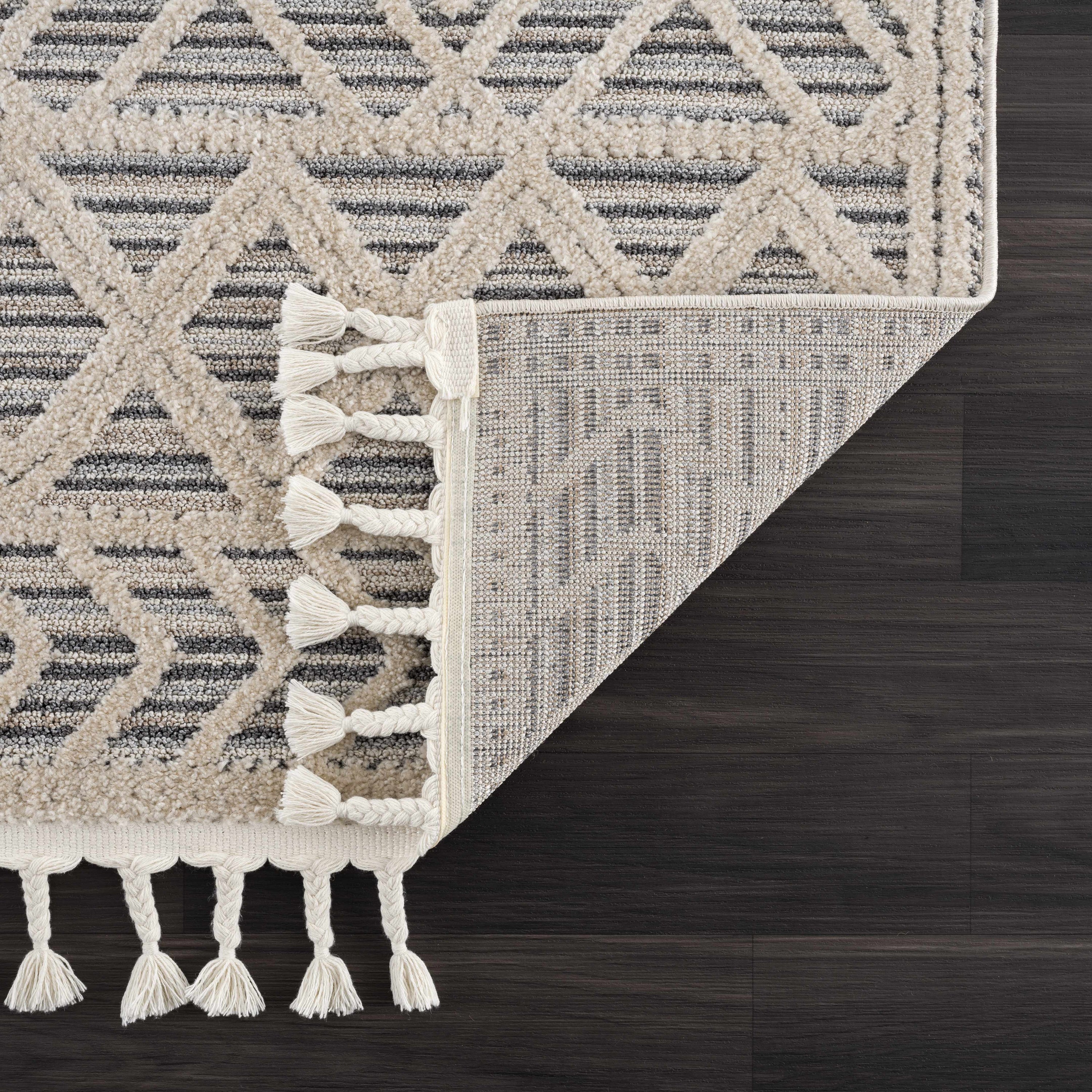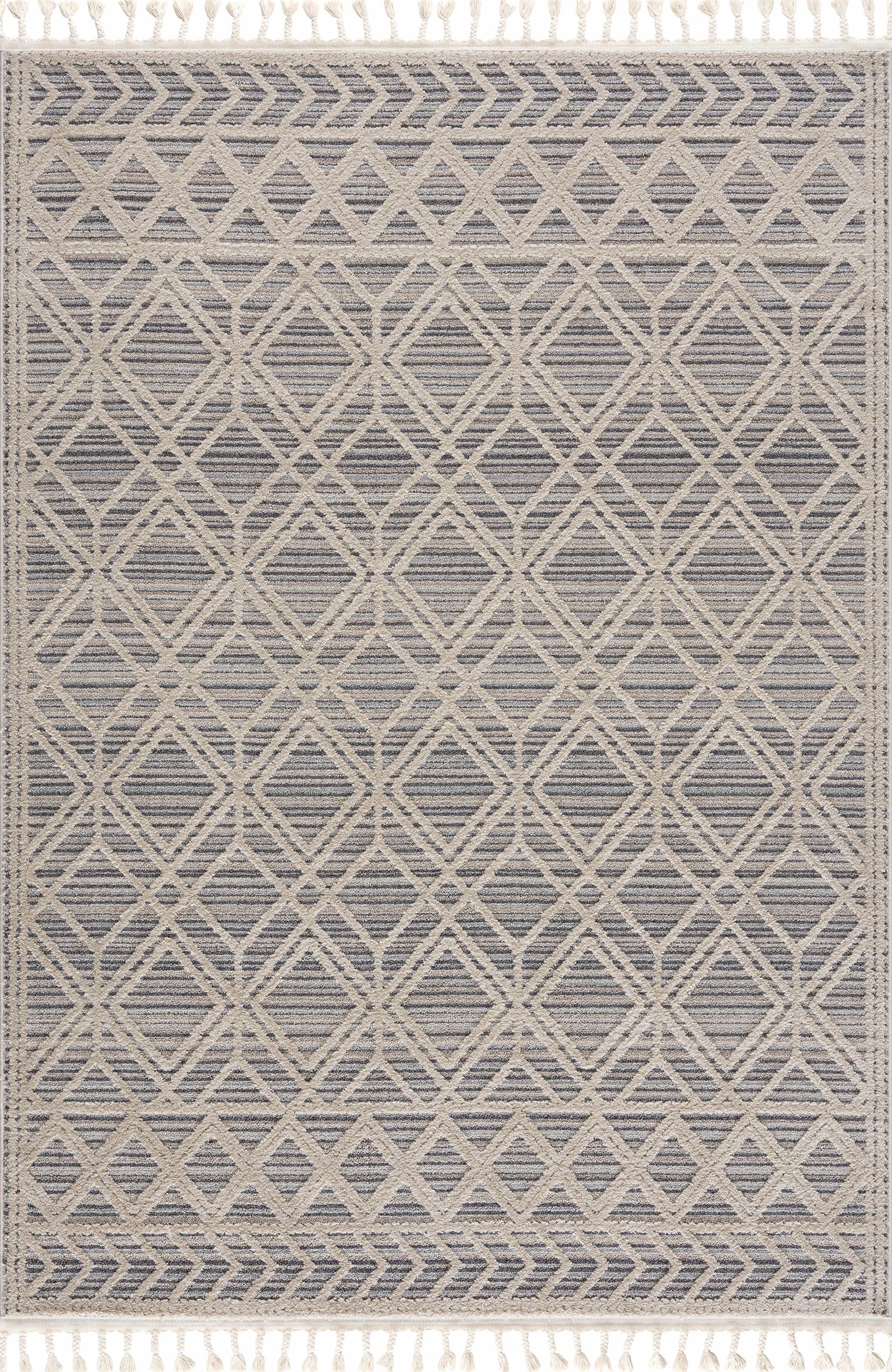 The Magnolia MGN-2300 area rug features embossed diamond and trellis patterns, complemented by charming fringe accents and a high-low textured surface. Crafted for durability with a medium pile, it adds a soft, comfortable feel underfoot while enhancing your space with Bohemian and farmhouse-inspired design elements. Perfect for living rooms, bedrooms, or entryways, this versatile rug combines rustic charm with lasting quality.