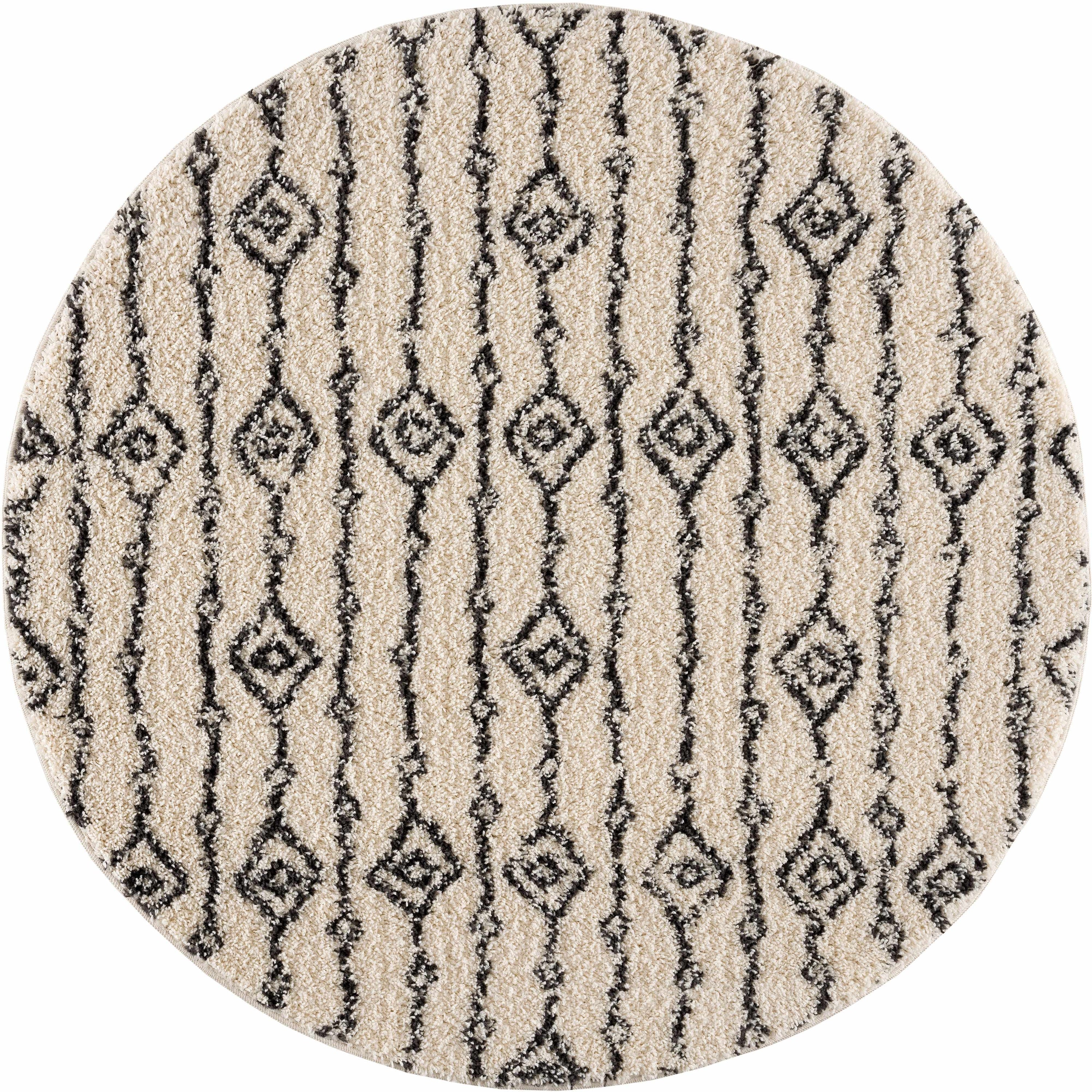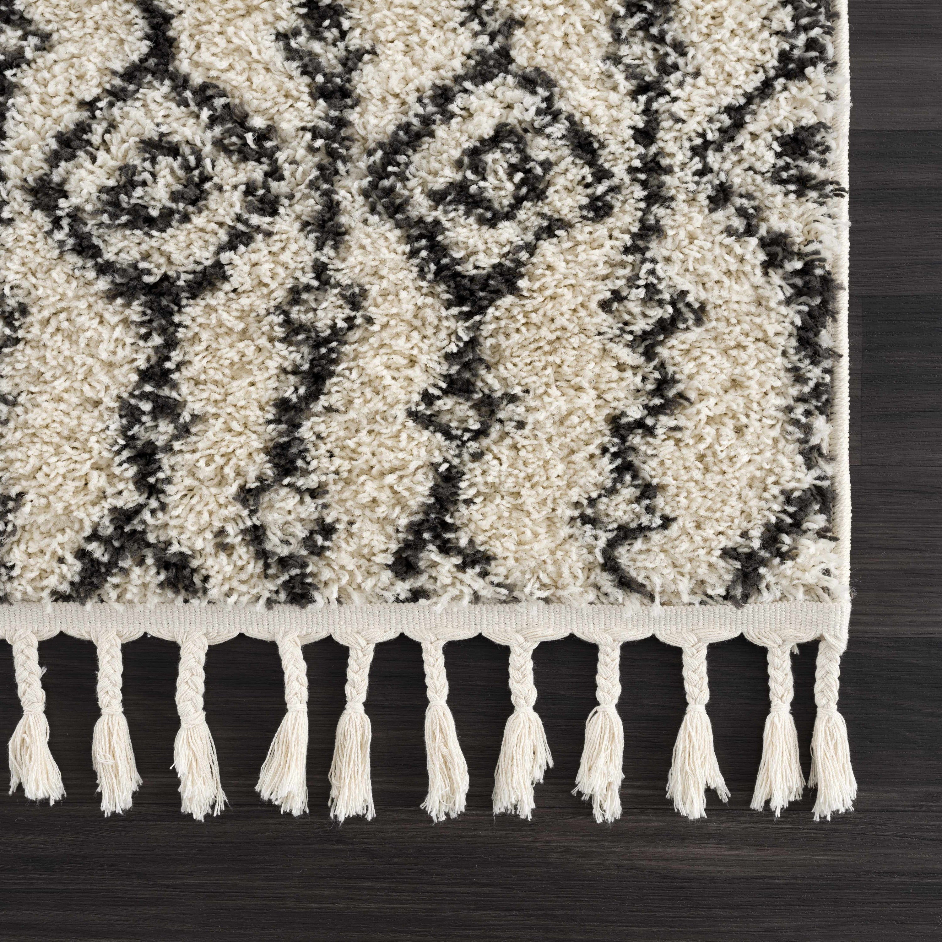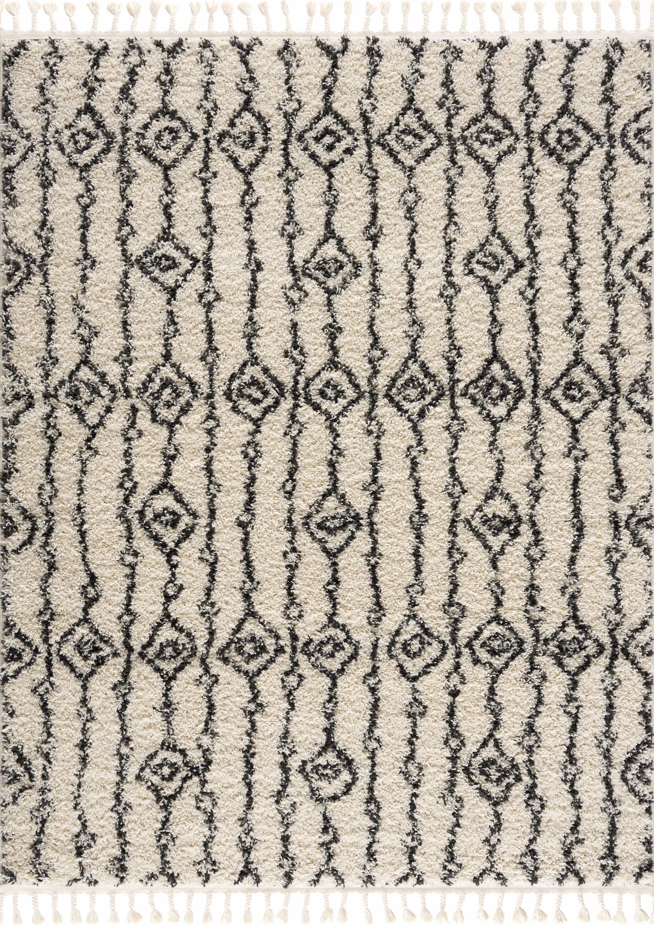 The Bayanga plush area rug features a cream base with bold charcoal Aztec patterns, bringing bohemian flair to any space. Its shag pile (1.26") provides a soft, luxurious feel underfoot, while fringe accents add visual interest and style. Crafted from 100% polypropylene with a durable machine-woven construction and polyester backing, this rug is perfect for modern, eclectic, or southwestern-inspired interiors, enhancing both comfort and aesthetic appeal.