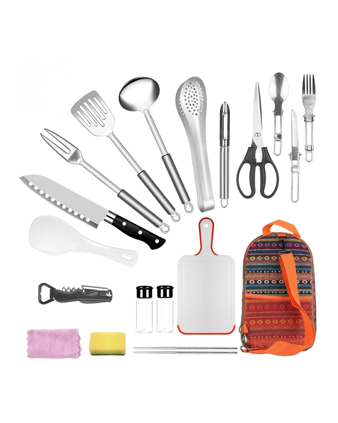 - *What You Get*: This 19Pcs camping utensil kit provides all of cooking tools while minimizing bulk,including 1x sushi knife,1 pair x scissors,1xslotted turner,1xBBQ fork,1xscale scraper,1xbottom opener,1xclip,1xsoup ladle,1xknife,1xspoon,1xfork,1xrice spatula,1xcutting board,2xseasoning bottles,1xcleaning cloth,1xcleaning cotton,1 pair x chopsticks,and 1xstorage bag. Make it easier to prepare healthy food outdoors.