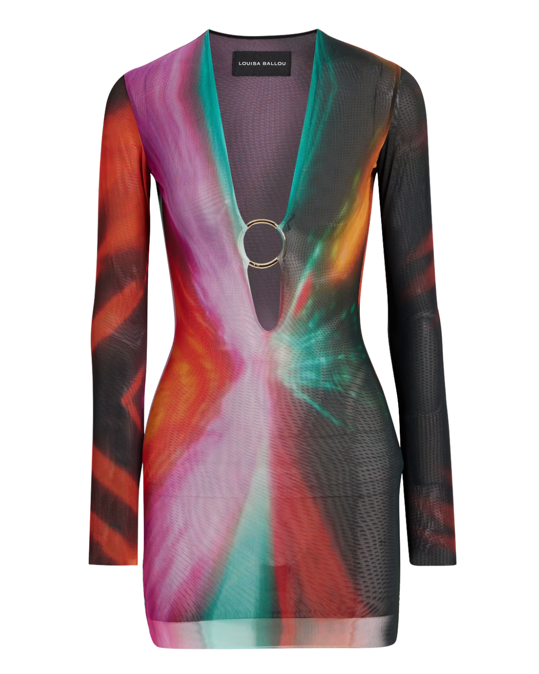Description: Louisa Ballou Printed Mini Dress showcases the brand’s signature tropical-inspired artistry with a striking blend of red, purple, green, and black hues. Crafted from stretch fabric for a sleek, sculpted silhouette, this vibrant mini is both playful and bold—perfect for standout summer styling. In excellent condition.