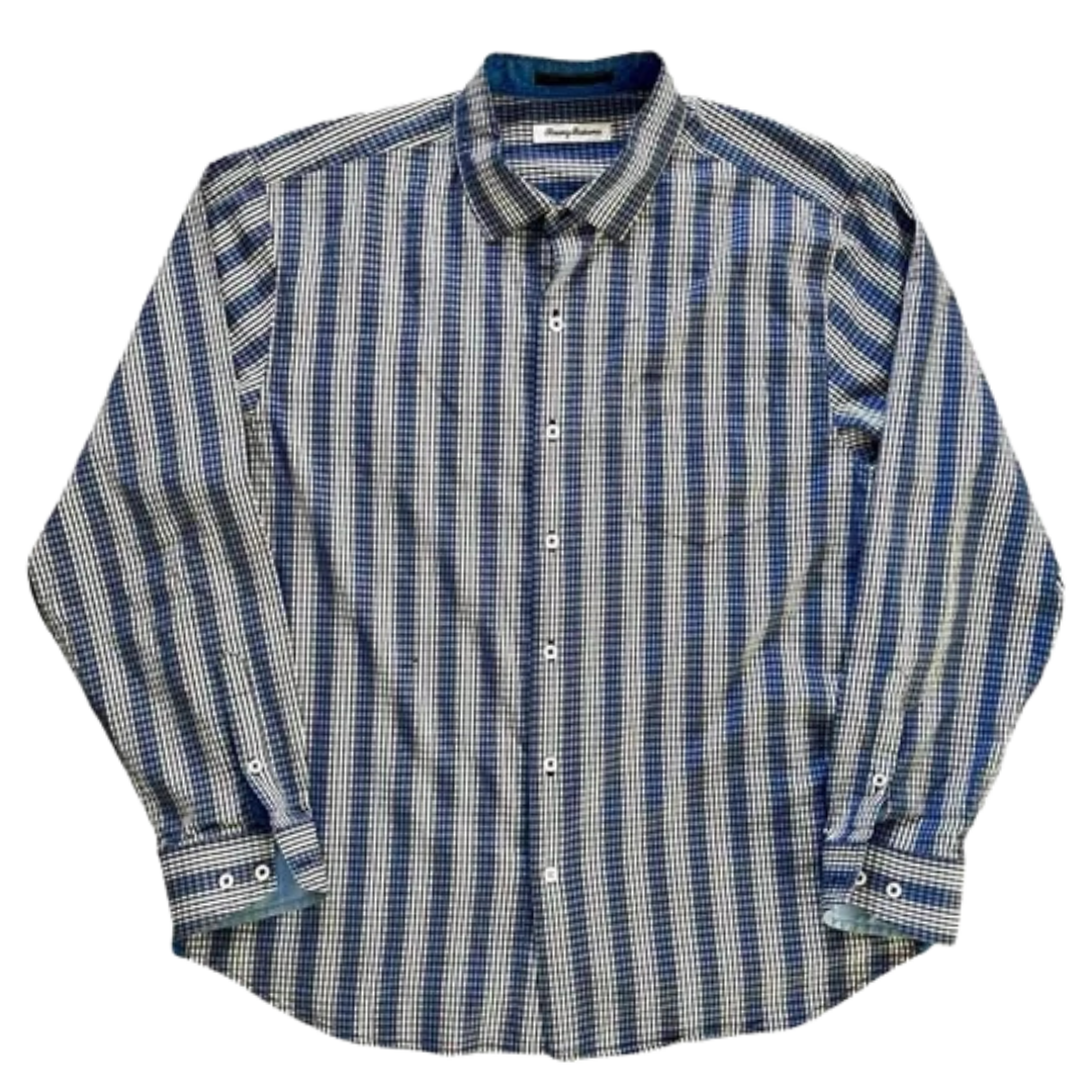 Description: Tommy Bahama Button-Down Shirt in light grey and dark grey delivers the brand’s signature relaxed island style with a versatile neutral palette. Crafted from soft cotton blend fabric, this shirt offers breathable comfort and timeless casual sophistication. A dependable Tommy Bahama essential in great condition.