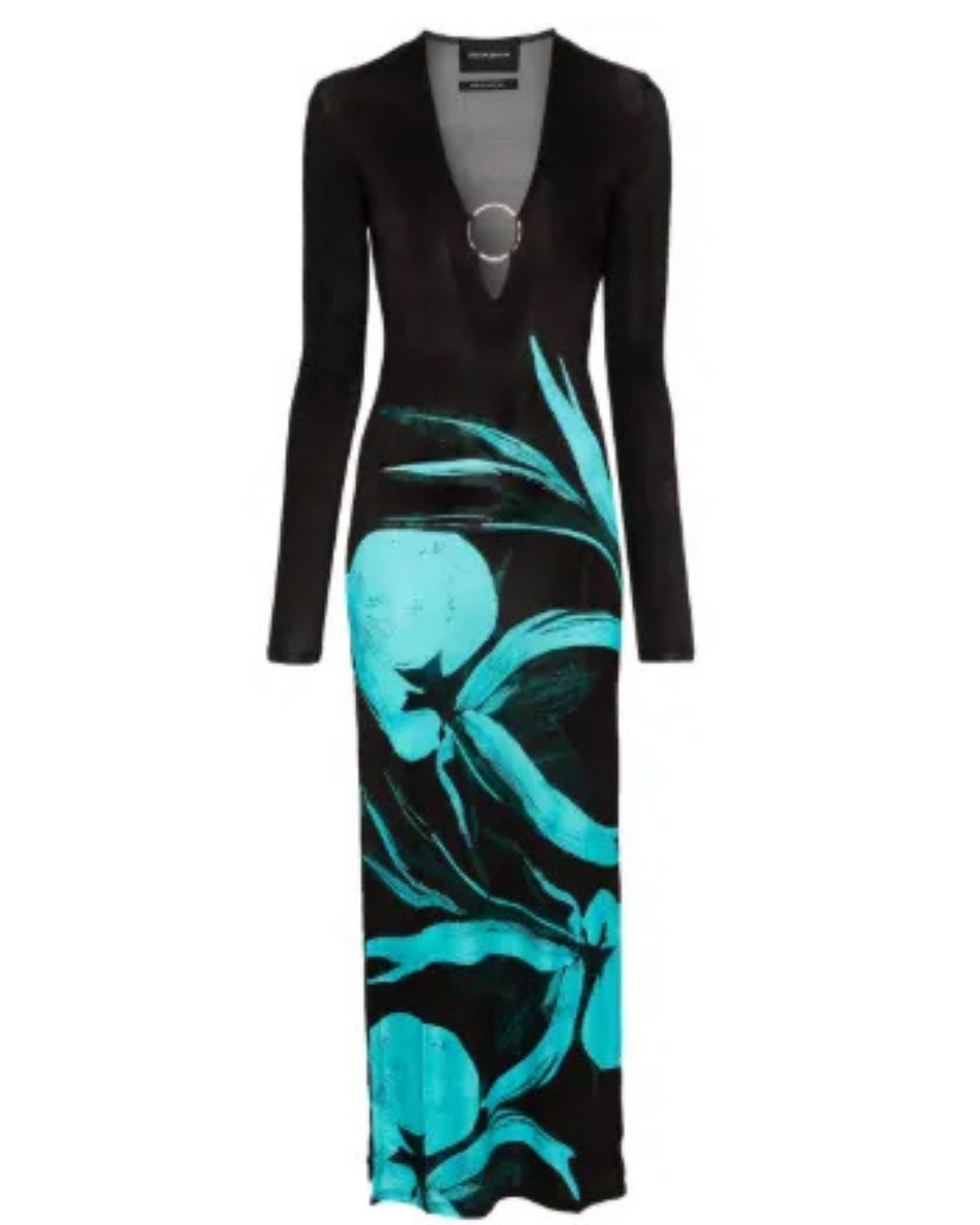 Description: Louisa Ballou Helios Printed Midi Dress showcases the brand’s signature bold prints in striking black and turquoise tones. Designed with a body-skimming silhouette and crafted from soft, stretch fabric, this piece balances elegance and edge — ideal for statement resort or evening wear. New without tags.