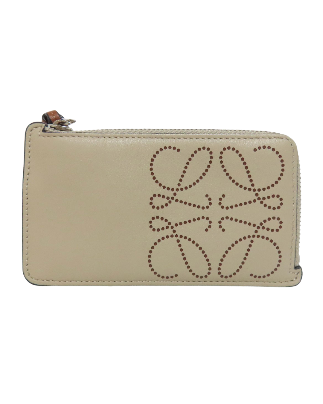 Description: LOEWE Anagram Logo Leather Coin Pouch in beige and dark brown showcases the house’s signature craftsmanship and timeless design. Made from supple calfskin leather, it features LOEWE’s embossed Anagram logo and a zip-around closure for secure storage of coins, keys, or small essentials. The compact silhouette fits easily into any handbag or pocket, making it both functional and stylish. Excellent condition with minimal signs of handling — a sophisticated everyday accessory.