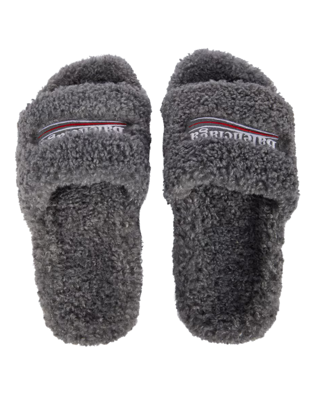 Description: Balenciaga Furry Slides blend playful texture with signature luxury. Designed in grey faux fur with white and red logo detailing, they offer a soft cushioned footbed and slip-on silhouette. Perfect for lounging or casual wear, these slides are in excellent condition with minimal signs of wear.