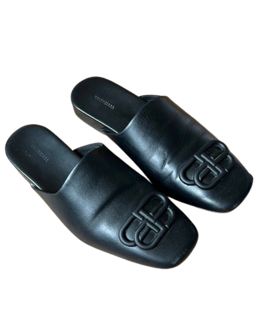 Description: Balenciaga Logo Mules in black deliver sleek sophistication with the brand’s modern minimalist aesthetic. Crafted from smooth leather, these slip-on heels feature a pointed toe, mid-height heel, and the signature Balenciaga logo across the upper. Perfect for both casual and elevated looks, they offer comfort and polish in one refined design. Excellent condition with clean soles and minimal signs of wear.