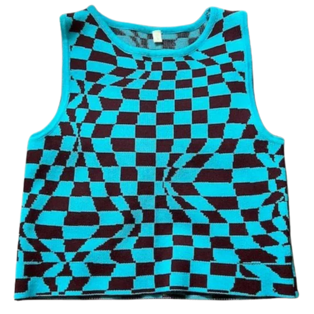 Description: Paloma Wool Checkered Top in blue and black showcases the brand’s signature artistic flair through its bold geometric pattern and flattering fitted silhouette. Crafted from soft, breathable fabric, it’s a versatile piece that transitions seamlessly from casual layering to elevated styling. In excellent condition.