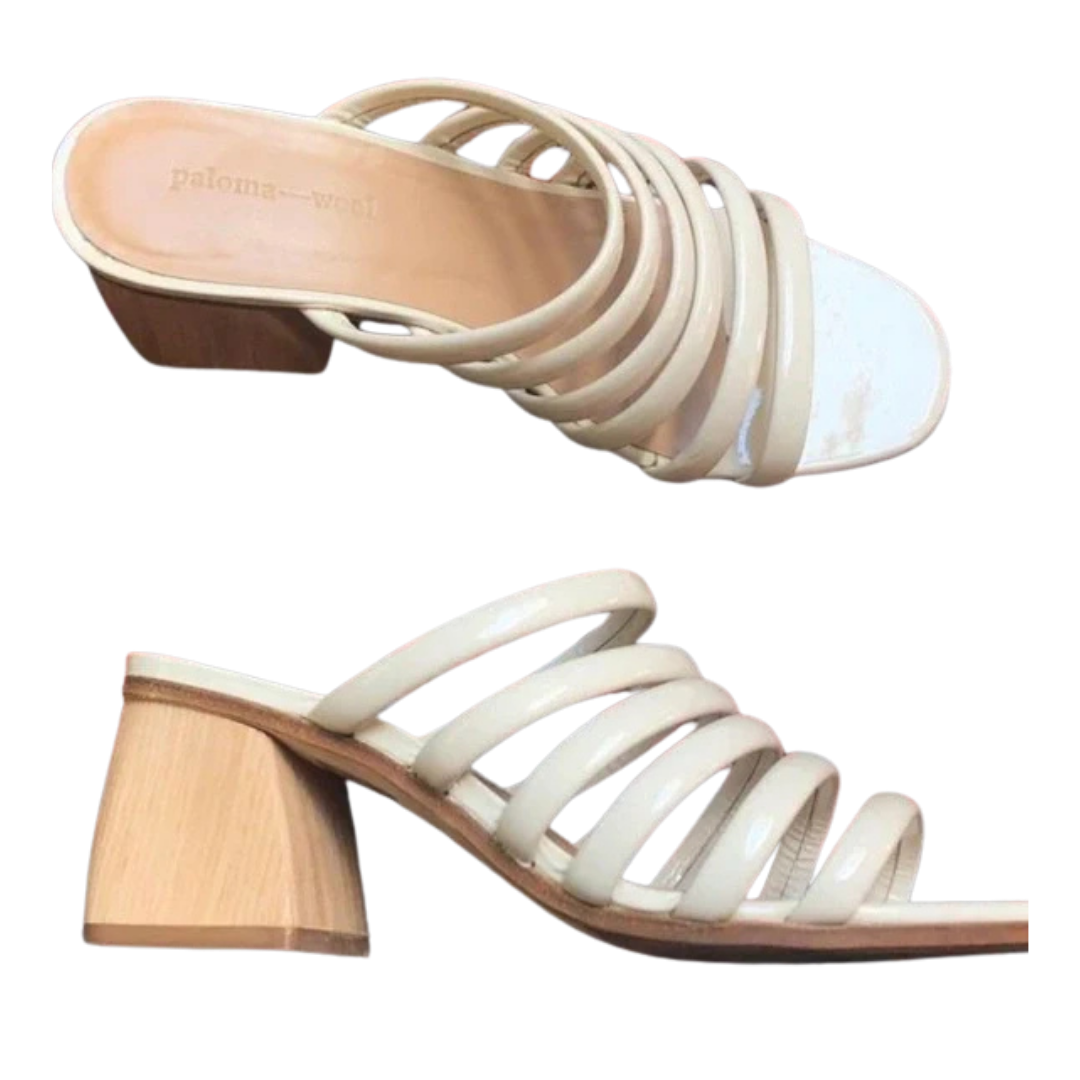 Description: Paloma Wool Maria Heels in white and beige feature a sculptural, minimalist silhouette that reflects the brand’s modern aesthetic. Crafted with smooth leather uppers and a comfortable block heel, these shoes elevate any look with understated sophistication. In excellent condition.