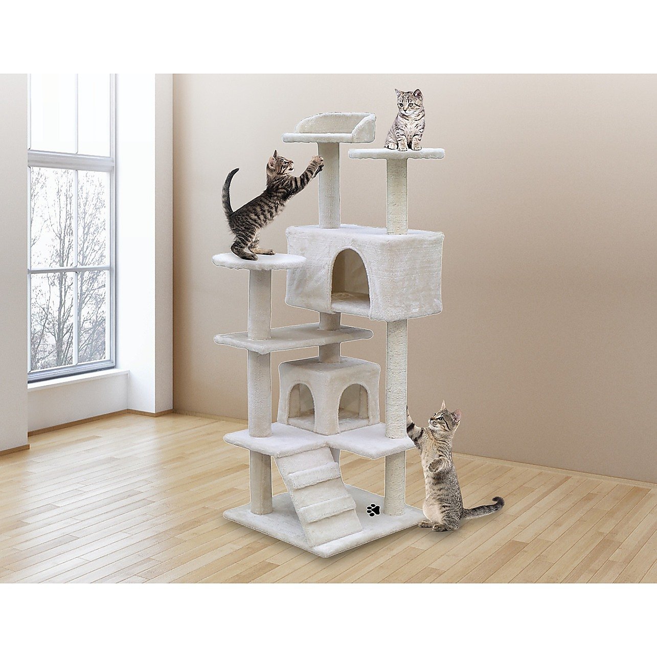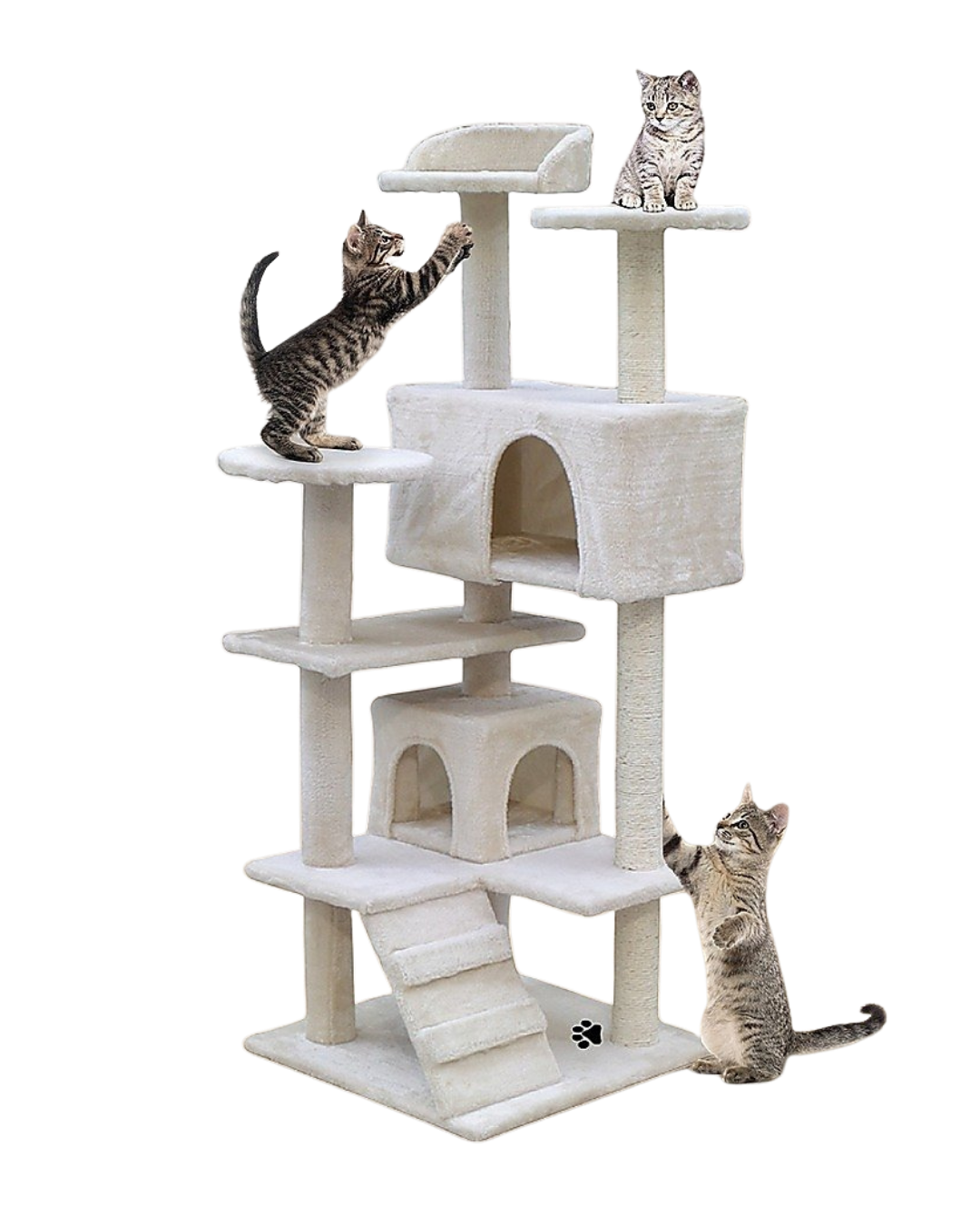 This 132 cm cat tree provides a complete activity and relaxation space for cats, offering multiple perches, two enclosed hideaway rooms, and several sisal-wrapped scratching posts. Built from fir timber, natural sisal, and plush carpeting, it delivers durability, comfort, and a safe place for cats to climb, rest, and sharpen their claws. The neutral beige and off-white tones blend easily with most home styles. Designed for multi-cat use, this cat tree helps protect furniture while giving pets a dedicated environment of their own.