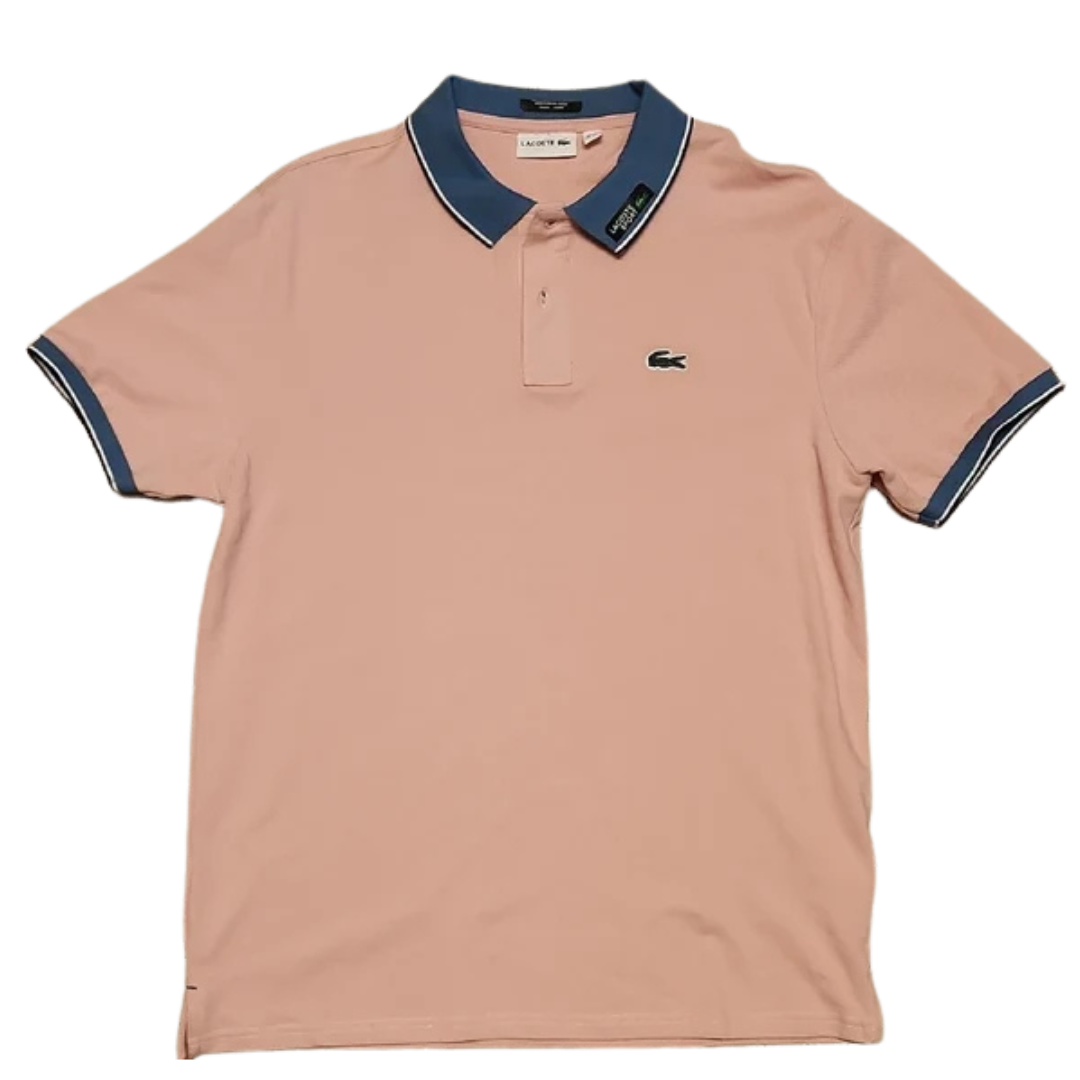 Description: Lacoste Polo Shirt in salmon with navy blue trim on the collar and sleeves showcases a refined twist on the brand’s classic design. Crafted from breathable cotton piqué and finished with the signature crocodile logo, this polo blends sporty sophistication with everyday comfort. A standout Lacoste piece in excellent condition.