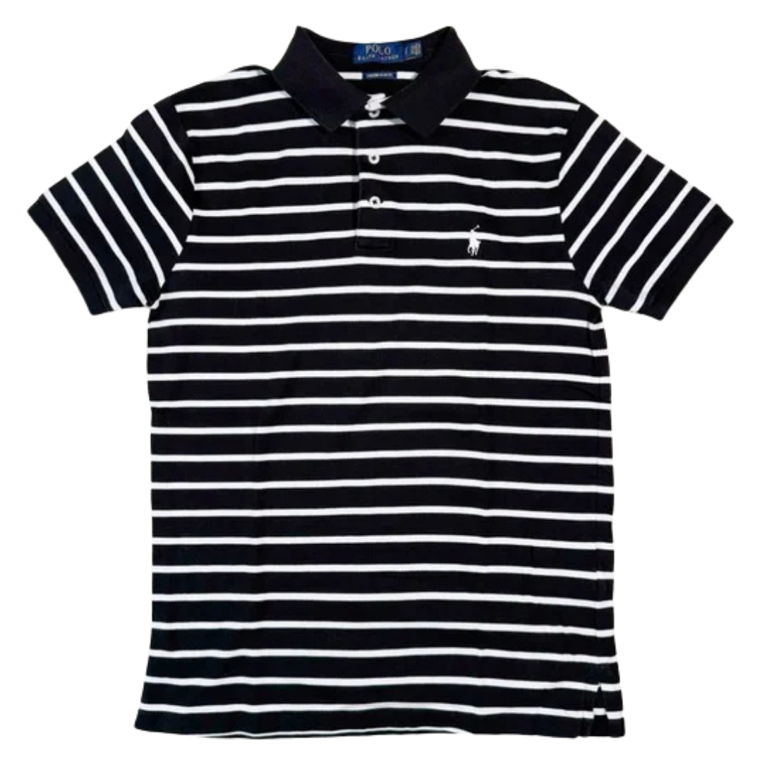 Description: Ralph Lauren Polo Shirt in black and white stripes offers a timeless, versatile look with soft cotton construction and the brand’s signature casual style. Designed for everyday comfort, this piece balances classic preppy influence with laid-back ease. A Ralph Lauren staple in great condition.