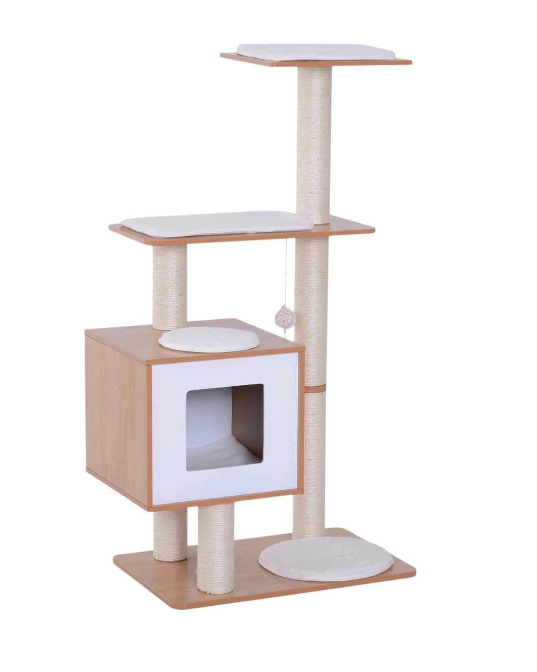 This premium cat condo features multiple platforms for climbing and lounging, a cozy enclosed hideaway for peaceful naps, cushioned resting spots for added comfort, and sturdy scratching posts to help maintain healthy claws while protecting your furniture.