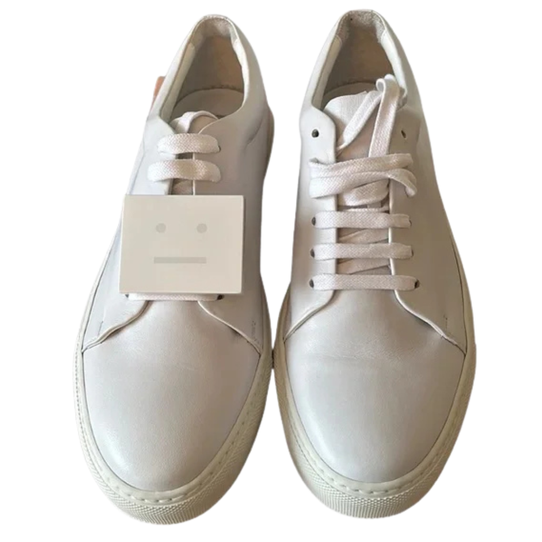 Description: Acne Studios Adriana Sneakers in white feature the brand’s signature minimalist design with a smooth leather upper, tonal laces, and the iconic face plaque detail on the tongue. Known for their clean Scandinavian aesthetic and durable craftsmanship, these sneakers remain stylish and wearable in good condition.