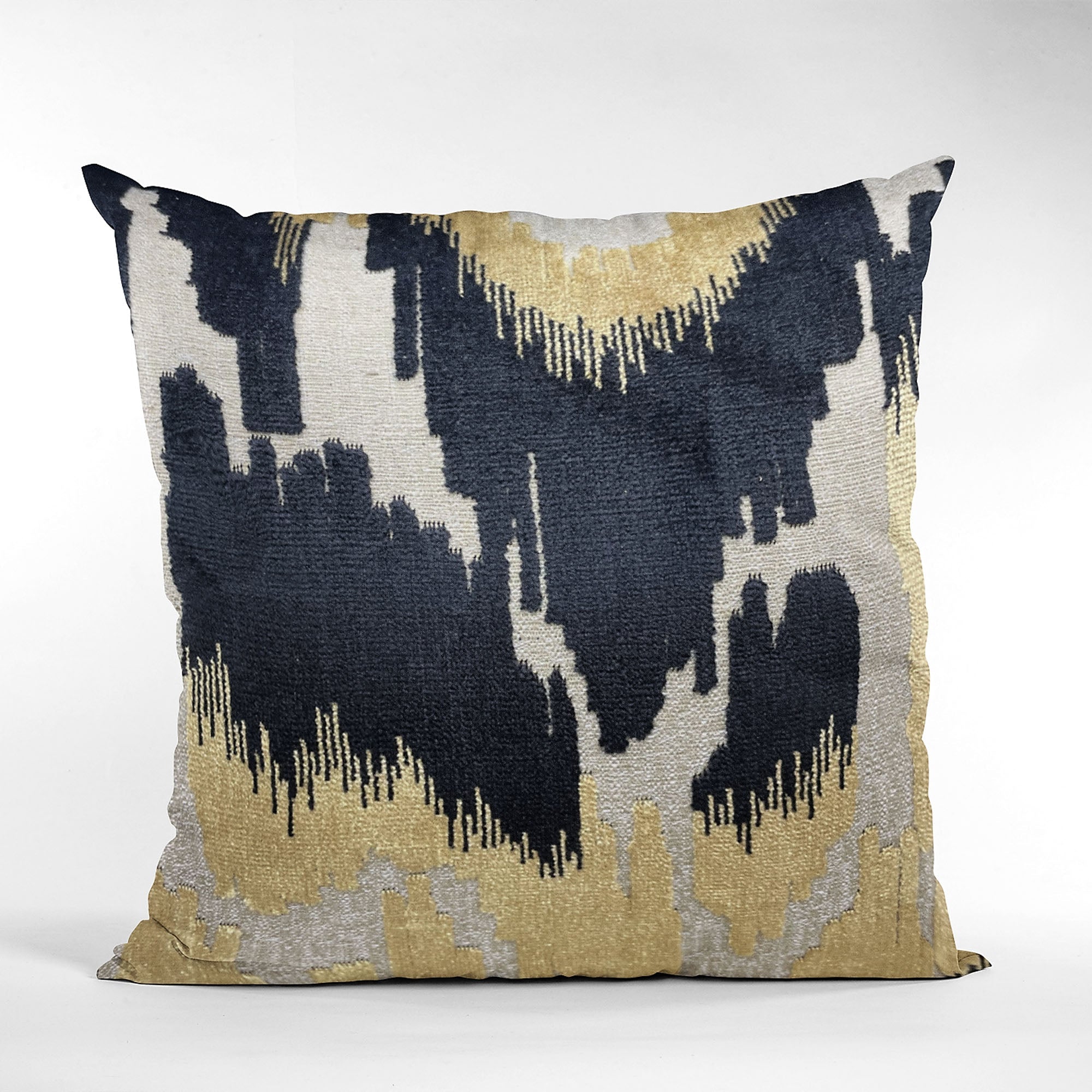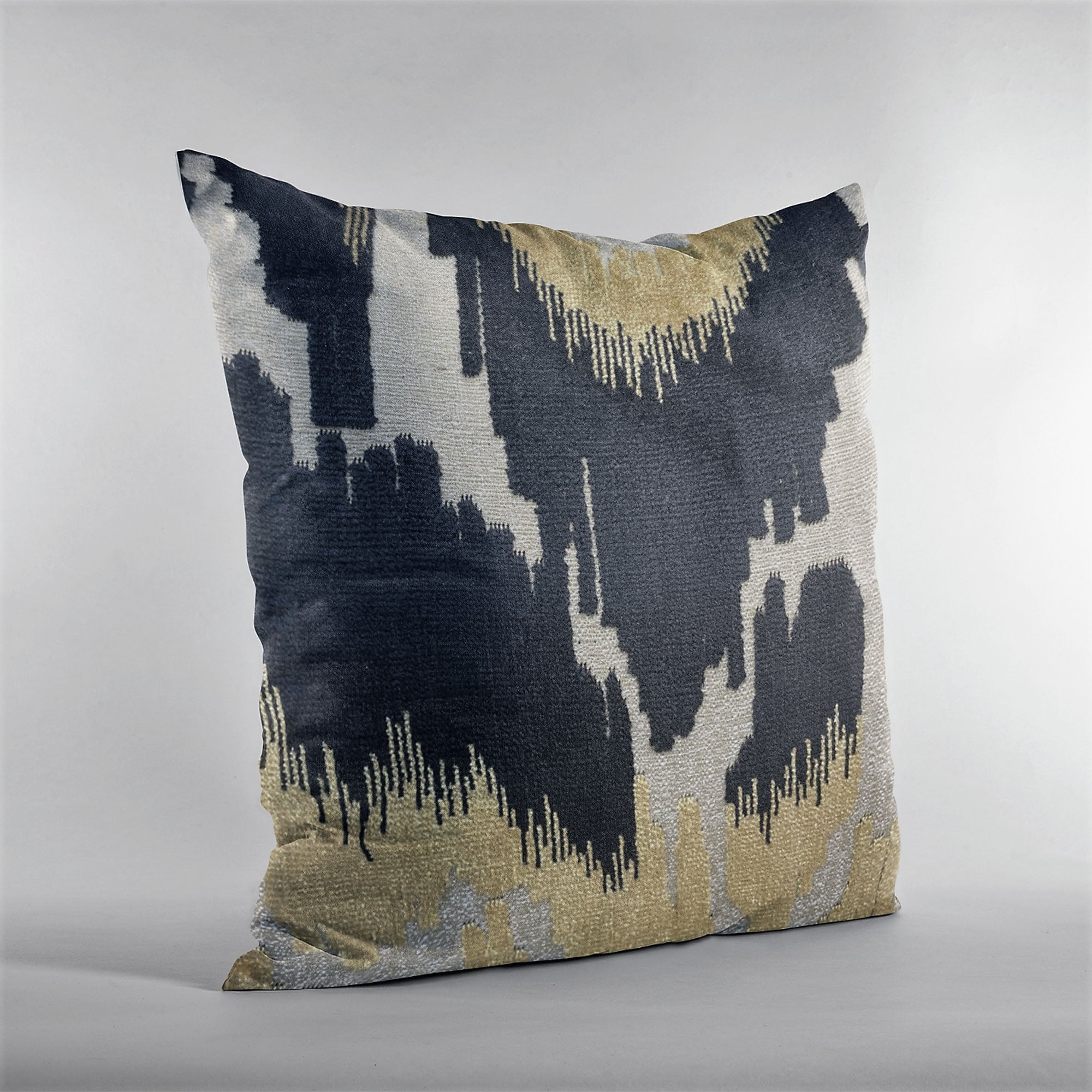 The Plutus Velvet Glamour Handmade Decorative Pillow adds a refined, high-end touch to any space with its striking black, gold, and cream Ikat pattern. Crafted in the USA, this double-sided pillow features an invisible zipper for a clean, tailored finish and over-locked seams for long-lasting durability. Each pillow includes a hypoallergenic down-alternative insert for plush comfort and support. With premium fabric construction and detailed workmanship, this piece brings both elegance and quality to sofas, chairs, and bedding arrangements.