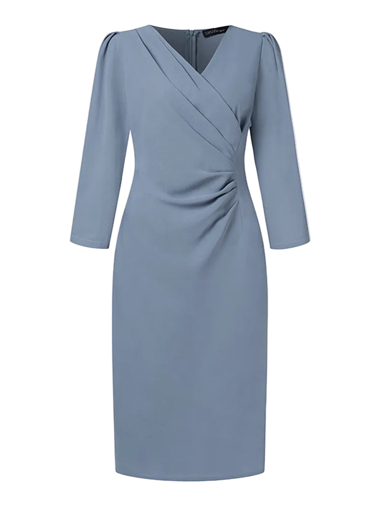 This dress combines effortless elegance with everyday comfort. Made from soft, lightweight 100% polyester, it features a flattering V-neckline, eight-quarter sleeves, and a knee-length cut suitable for all seasons. The back zipper adds convenience while maintaining a sleek silhouette.