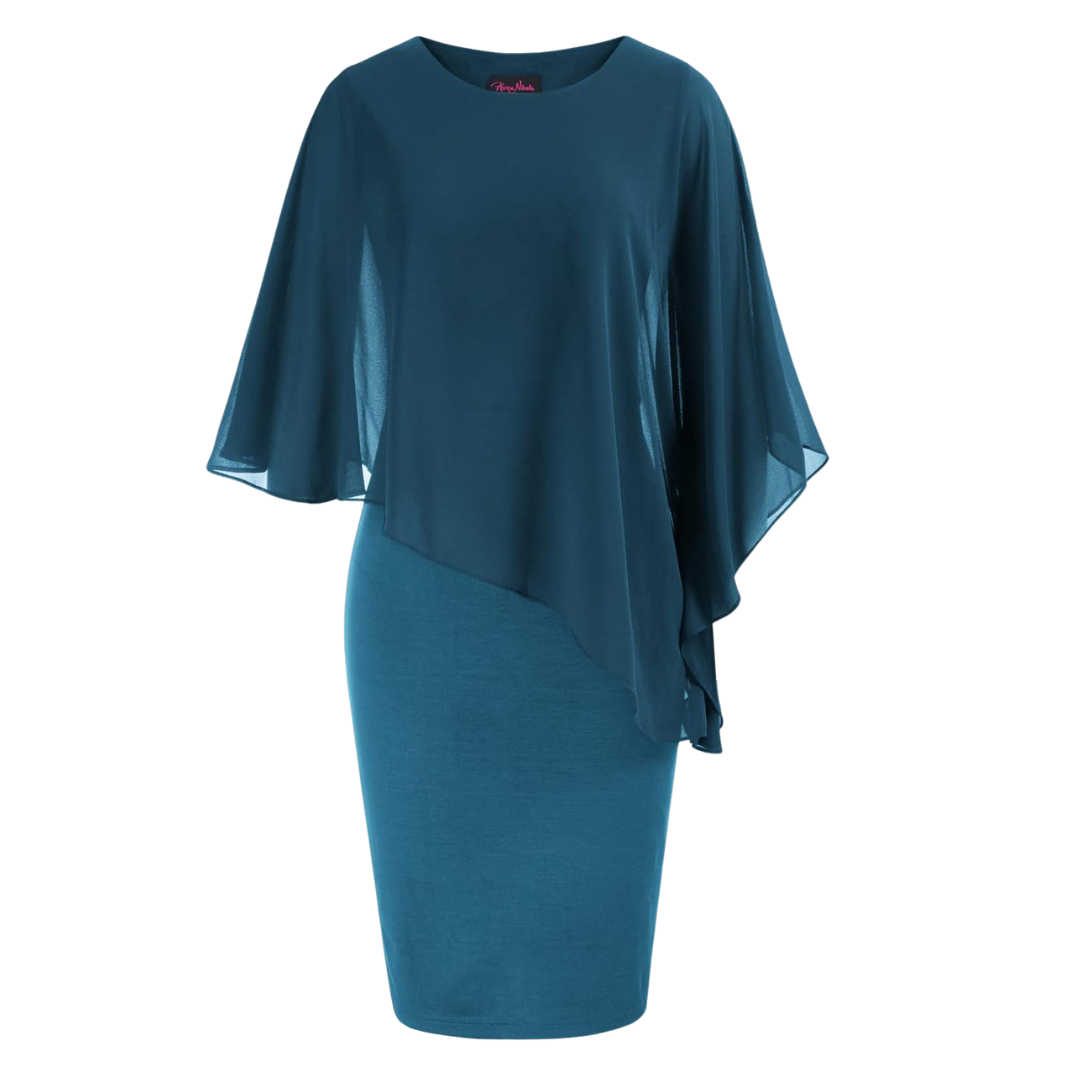 Description: The Hanna Nikole Sleeveless Cape Dress combines elegance with modern flair. Featuring a flowing attached cape overlay that drapes beautifully over the shoulders, this turquoise dress creates a sophisticated yet effortless silhouette. The sleeveless design and smooth, stretch fabric offer comfort and movement, making it perfect for special occasions or formal events. In excellent condition — a statement piece that radiates confidence and style.