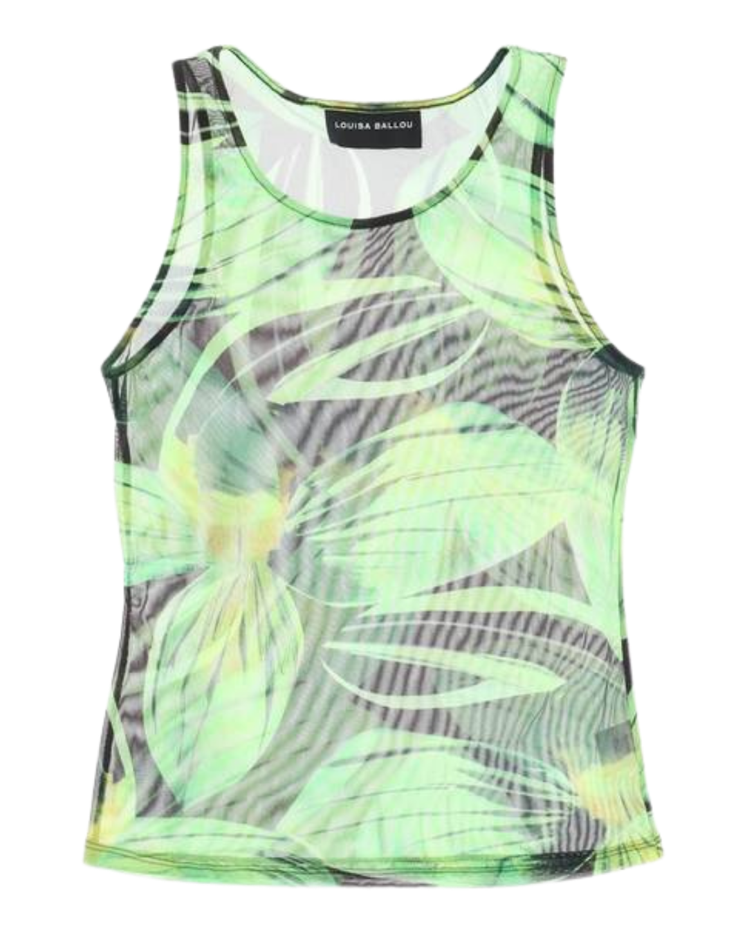 Description: Louisa Ballou Mesh Tank Top blends sporty edge with signature coastal flair. Featuring a semi-sheer green and black mesh design, this lightweight piece is perfect for layering or warm-weather wear. Excellent condition with no signs of wear.