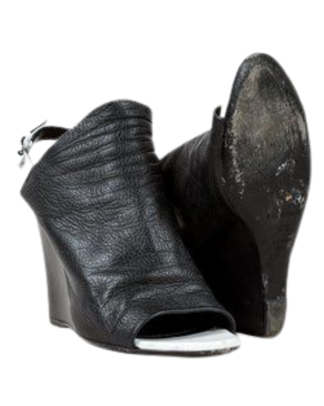 Description: Balenciaga Veau Papier Wedge Sandals in black showcase a sculptural silhouette crafted from supple calfskin leather. Featuring an open-toe design, wide cross straps, and a sleek wedge heel for modern elevation and comfort. The minimalist shape and premium craftsmanship make these sandals an elegant addition to any wardrobe. Excellent condition with clean soles and minimal signs of wear.
