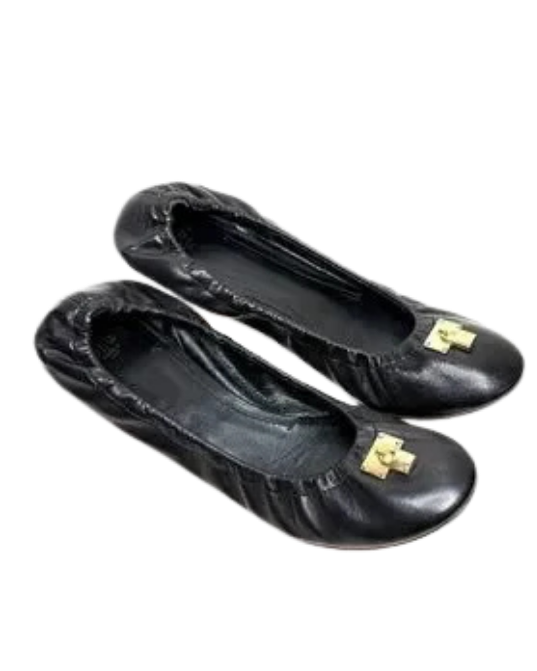 Description: LOEWE Padlock Leather Ballet Flats in black and gold offer a sophisticated balance of elegance and edge. Crafted from smooth leather, these flats feature gold-tone padlock accents at the toe, rounded silhouette, and soft leather lining for comfort. A refined everyday shoe that adds subtle luxury to any look. Good condition with gentle creasing and light sole wear consistent with careful use — timeless and chic with a hint of signature LOEWE craftsmanship.