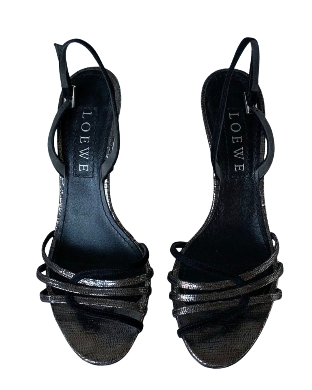Description: LOEWE Strappy Sandals in black showcase refined craftsmanship and timeless minimalism. Made from smooth leather with delicate crossover straps and an adjustable ankle buckle, these sandals offer both structure and comfort. The 3.5-inch heel provides a graceful lift, ideal for pairing with both tailored looks and evening wear. Excellent condition with clean leather, polished hardware, and minimal wear to the soles — a versatile statement of understated luxury.