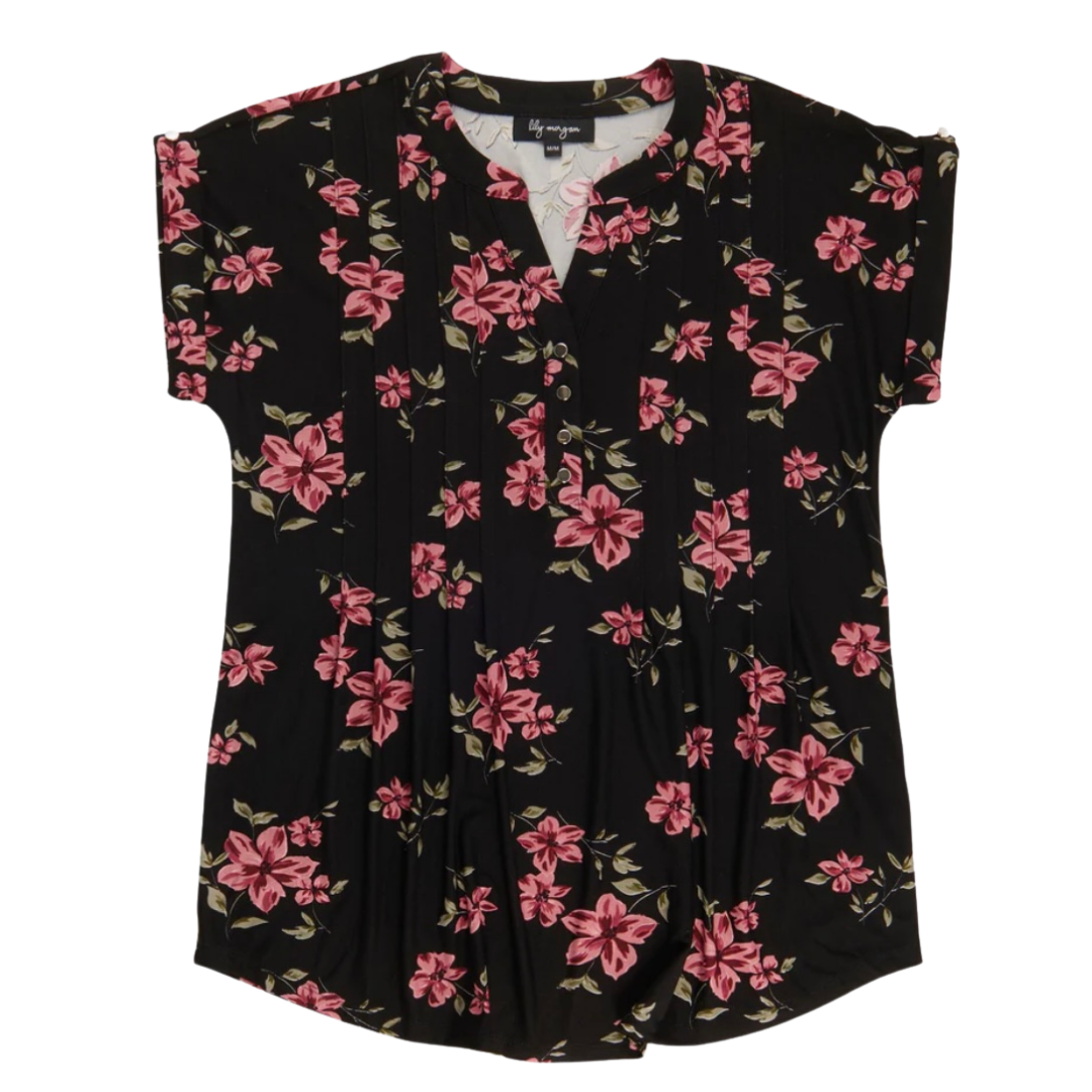 Description: The Lily Morgan Floral V-Neck Blouse blends everyday comfort with effortless femininity. Set on a classic black backdrop, the bold red and green floral pattern adds a vibrant touch to this flattering silhouette. Designed with a soft drape and a comfortable V-neckline, it pairs beautifully with jeans, trousers, or skirts for a polished yet relaxed look. In excellent condition — timeless, easy to wear, and perfect for any season.