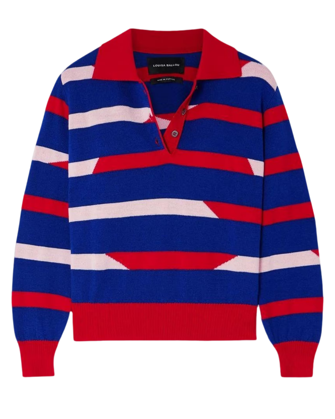 Description: Louisa Ballou Cruise Striped Knitted Sweater blends bold color and playful design in a soft, lightweight knit. The red, pink, and blue stripes create a vibrant statement piece that embodies the brand’s modern resort aesthetic. Finished with a relaxed fit and impeccable craftsmanship. In excellent condition.