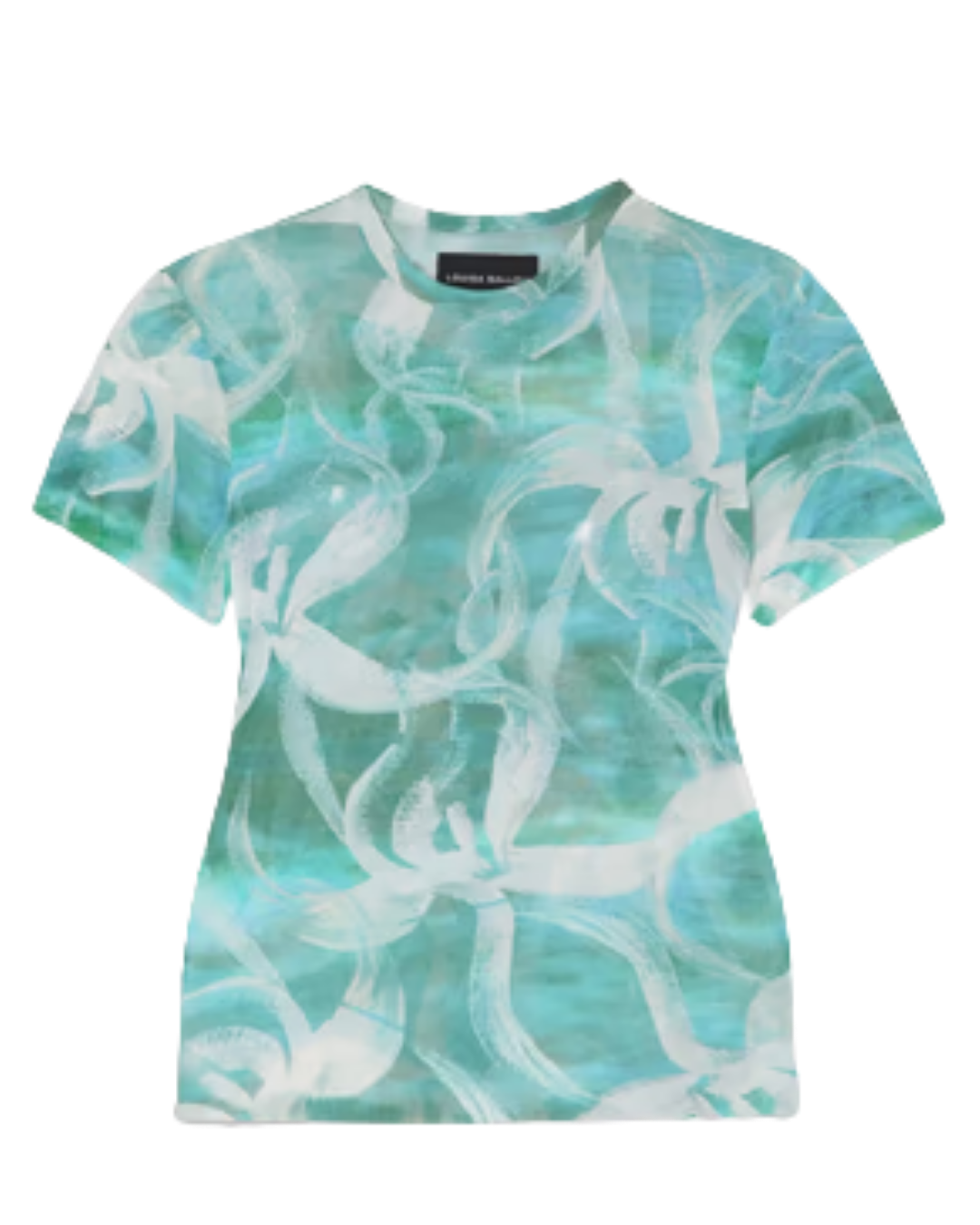 Description: Louisa Ballou Printed Tulle T-Shirt showcases a sheer, airy silhouette with blue and white abstract detailing. Crafted from soft stretch tulle, this top reflects the brand’s signature art-inspired coastal aesthetic. Excellent condition, minimal signs of wear.