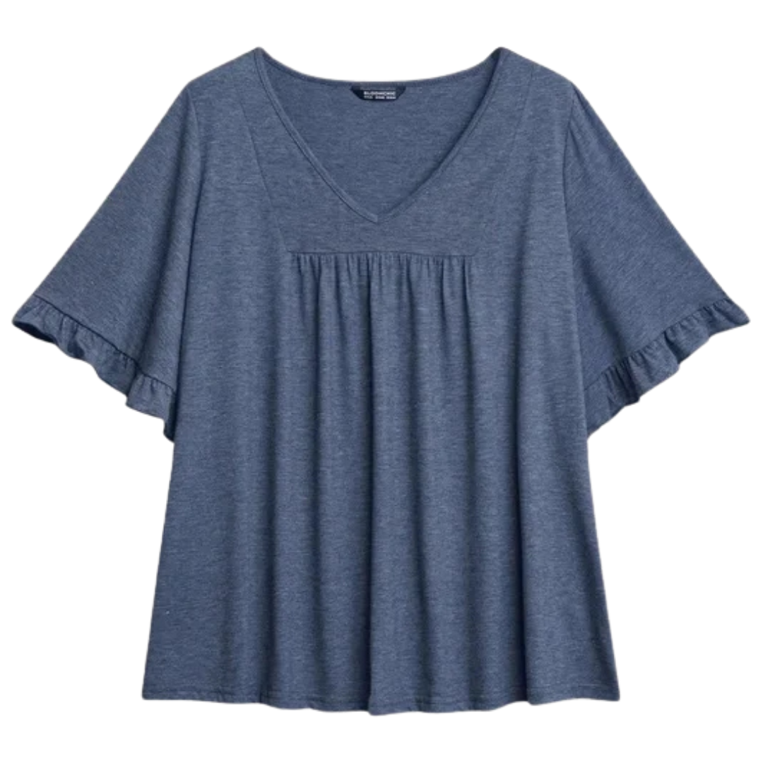 Description: This BloomChic Frill Trim T-Shirt brings a soft, feminine twist to an everyday essential. Designed in a rich blue shade, the top features delicate frill detailing along the neckline and sleeves, adding subtle texture and charm. The lightweight, breathable fabric makes it perfect for daily wear, while the flattering cut offers easy pairing with jeans, skirts, or casual trousers. In excellent condition with no flaws — a versatile, polished wardrobe staple.